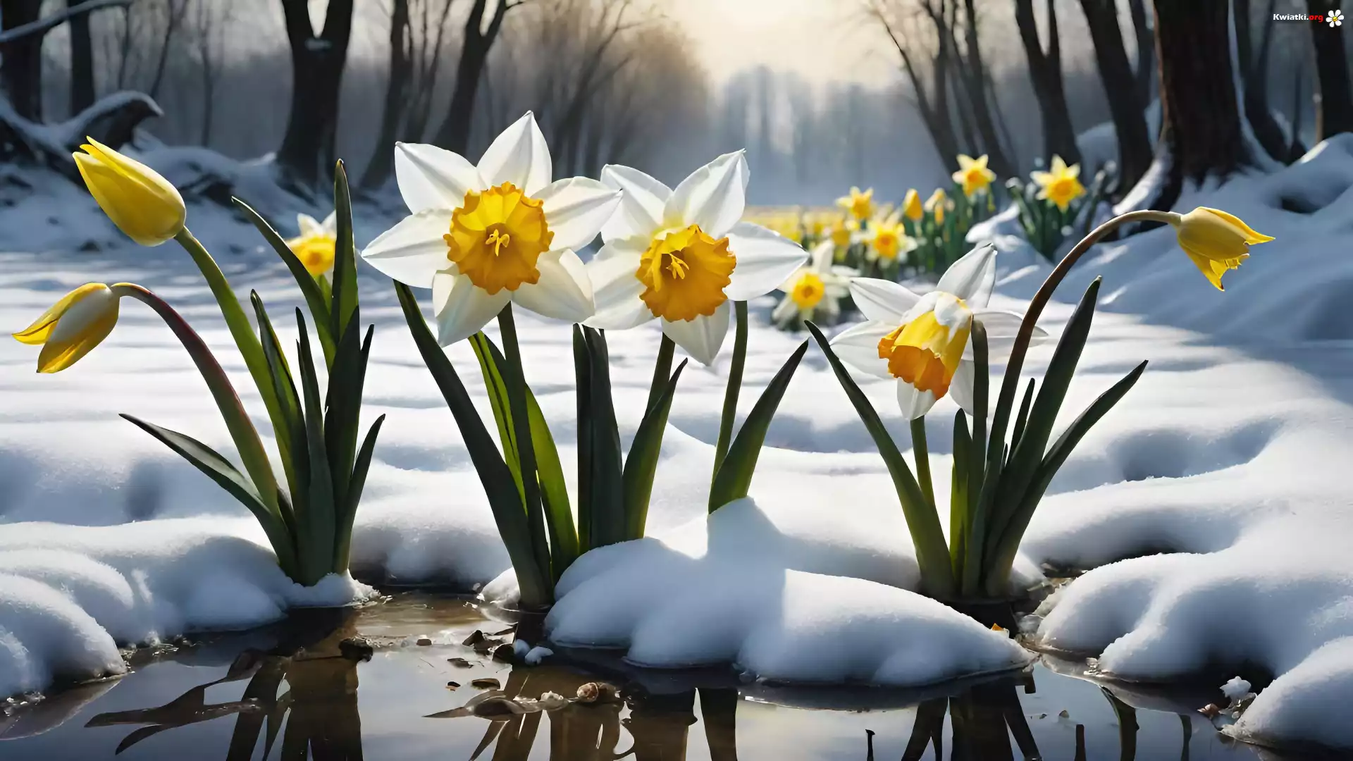 Zima, Śnieg, Drzewa, Kwiaty, Narcyzy żonkile - Zdjęcia