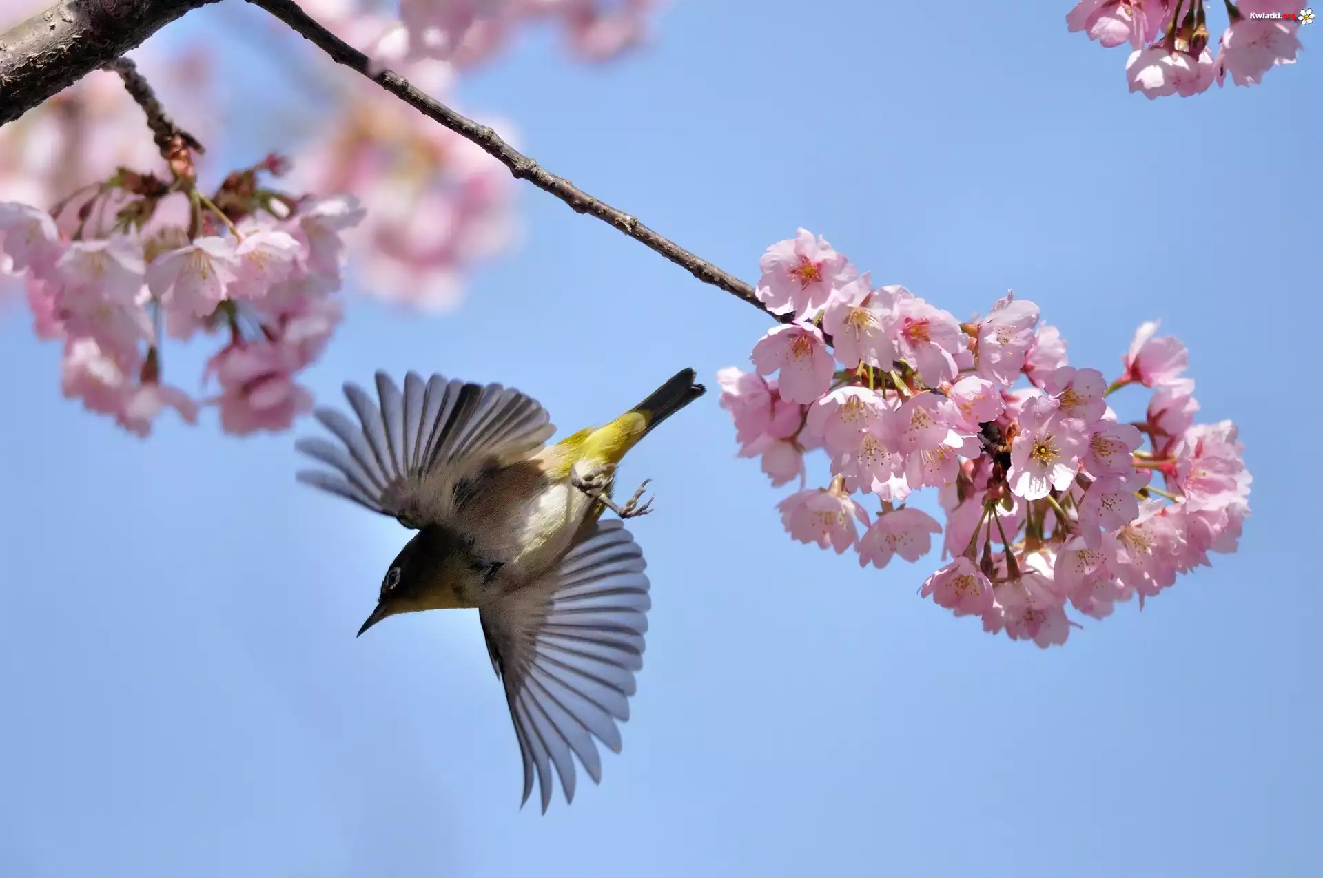 Kwiat Kwitnąca, Gałązka, Wiśni, Ptaszek, Lot
