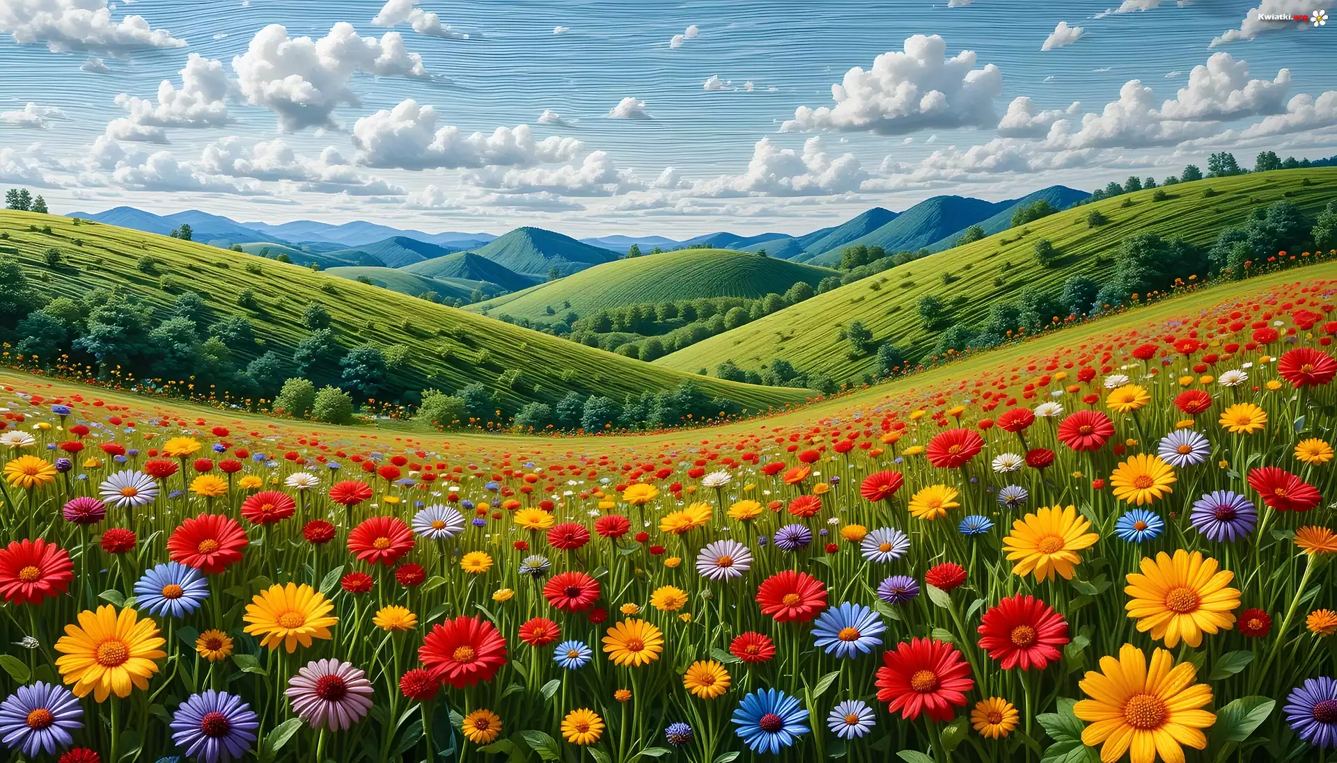 Przyroda, Natura, Kwiaty, Kolorowe, Pagórki, Wiosna, Kwitnienie, Łąka, Niebo, Chmury, Krajobraz - Zdjęcia |