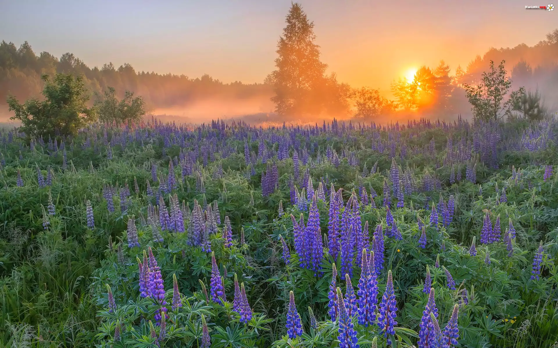Kwiat Wschód słońca, Mgła, Łąka, Łubin, Drzewa