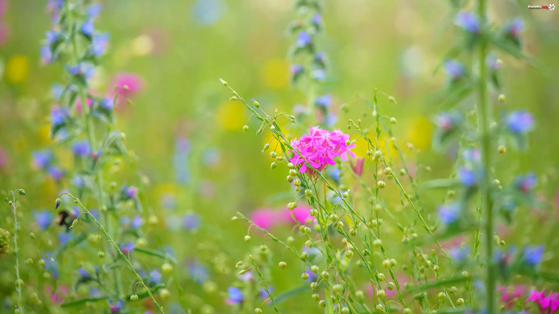 Jasnoróżowe, Niebieskie, Kwiaty, Łąka - Zdjęcia