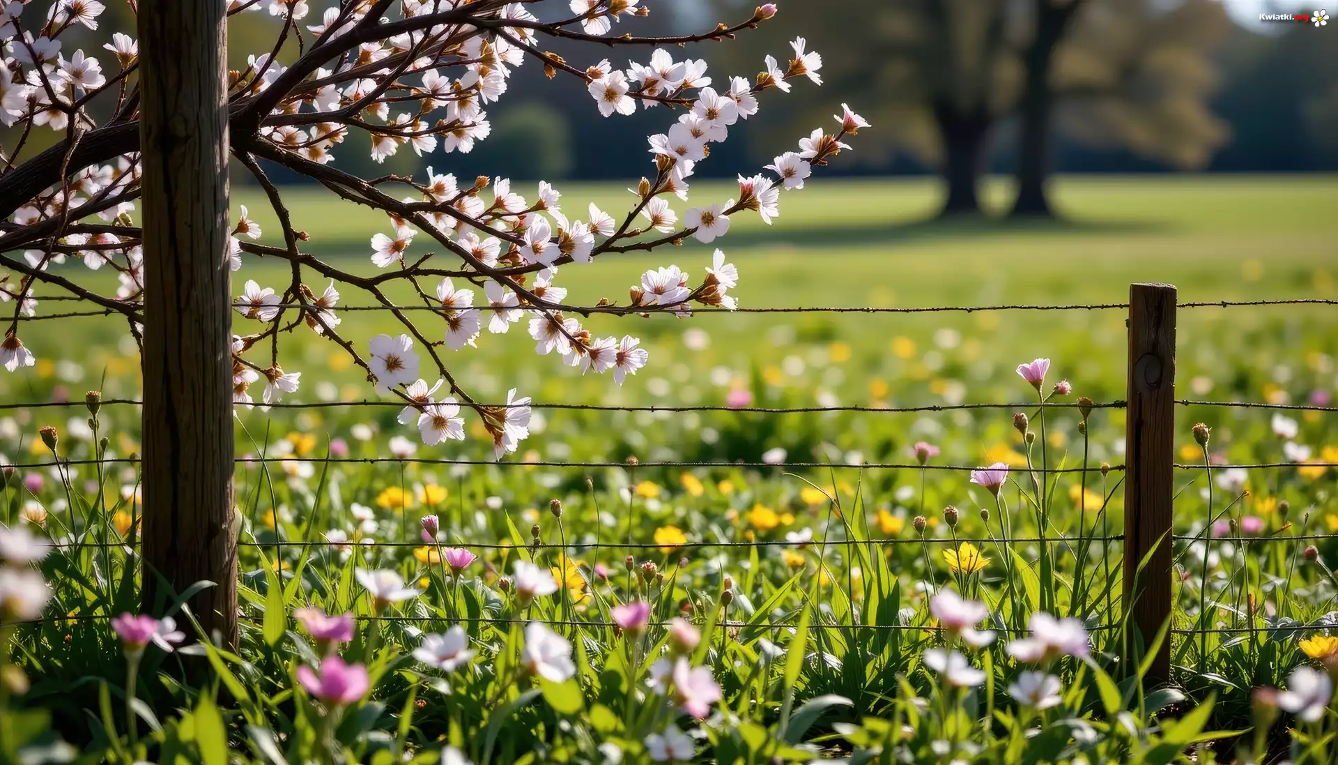 Wiosna, Ukwiecone, Gałązki, Łąka, Kwiaty, Ogrodzenie - Zdjęcia