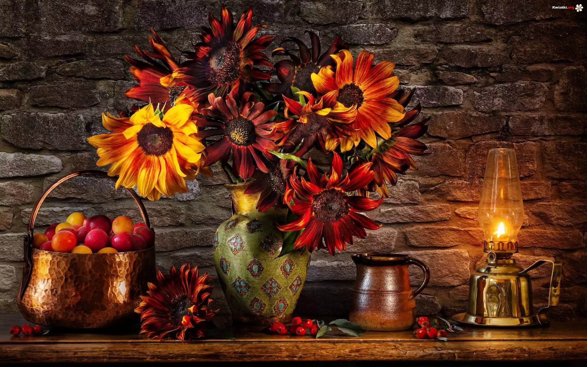 Kompozycja, Bukiet kwiatów, Lampa, Wazon, Jabłka, Słoneczniki - Zdjęcia
