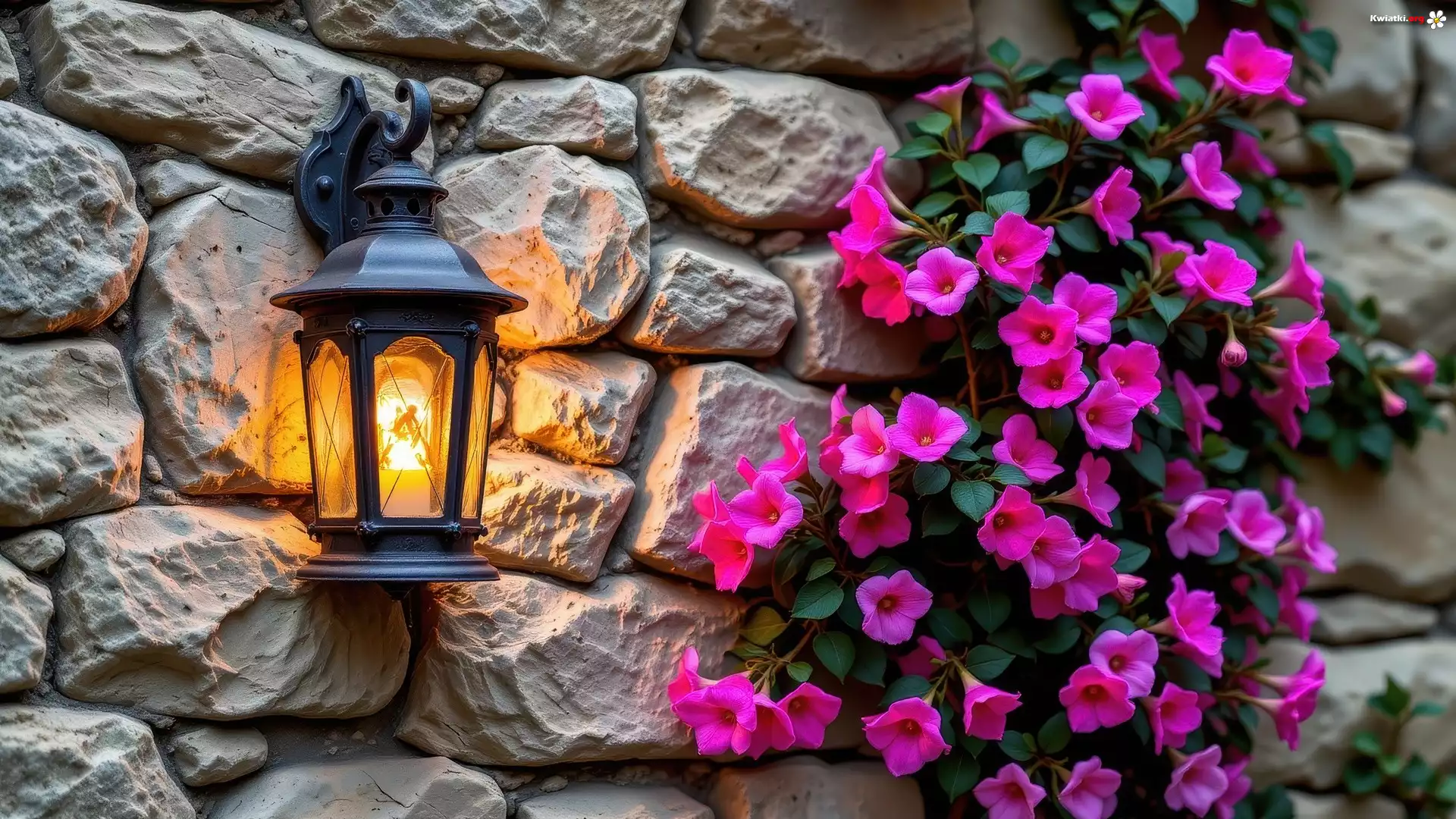 Murowana, Ściana, Świecąca, Lampa, Purpurowe, Kwiaty - Zdjęcia