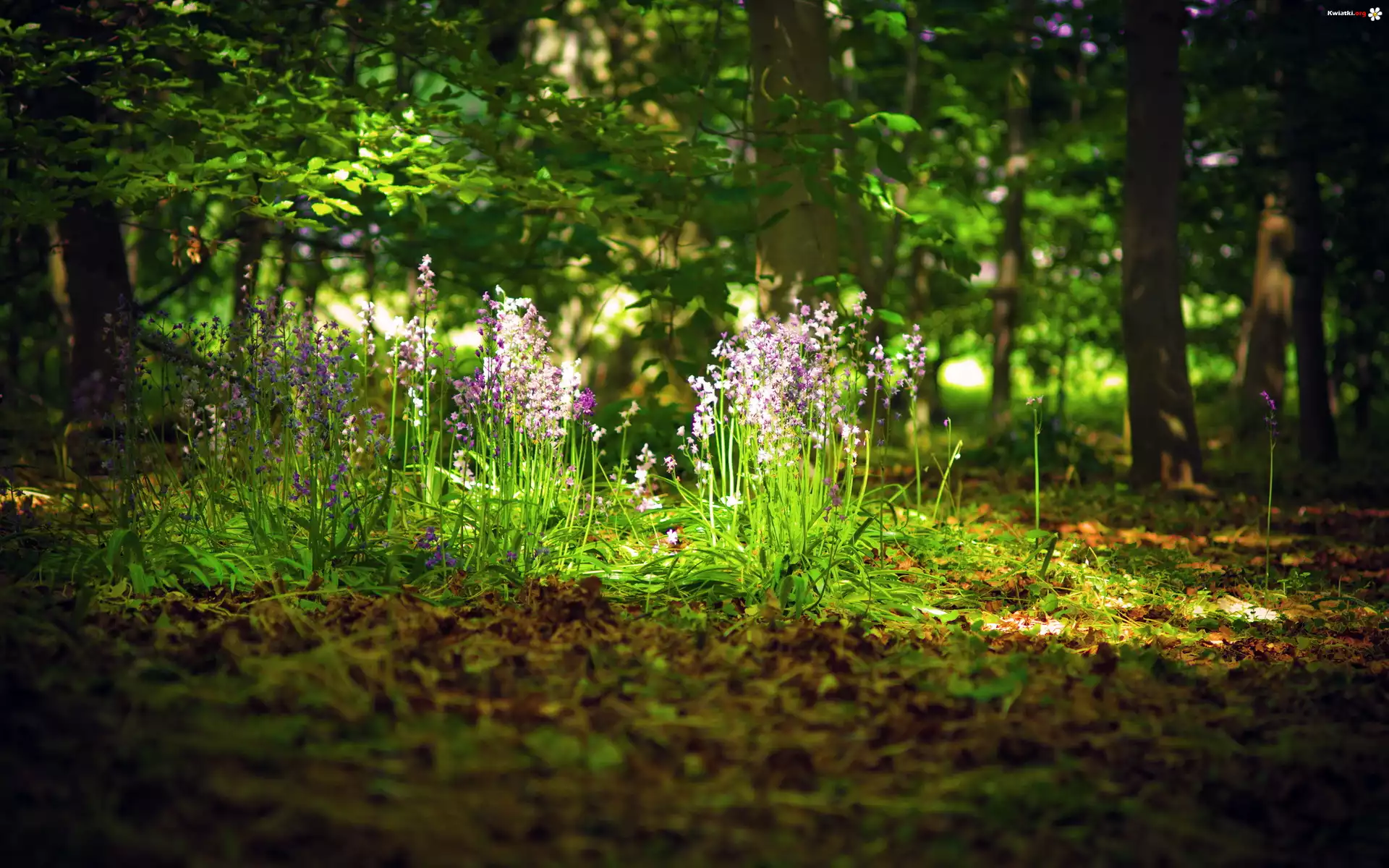 Las, Drzewa, Ściółka, Liście, Fioletowe, Kwiatki - Zdjęcia