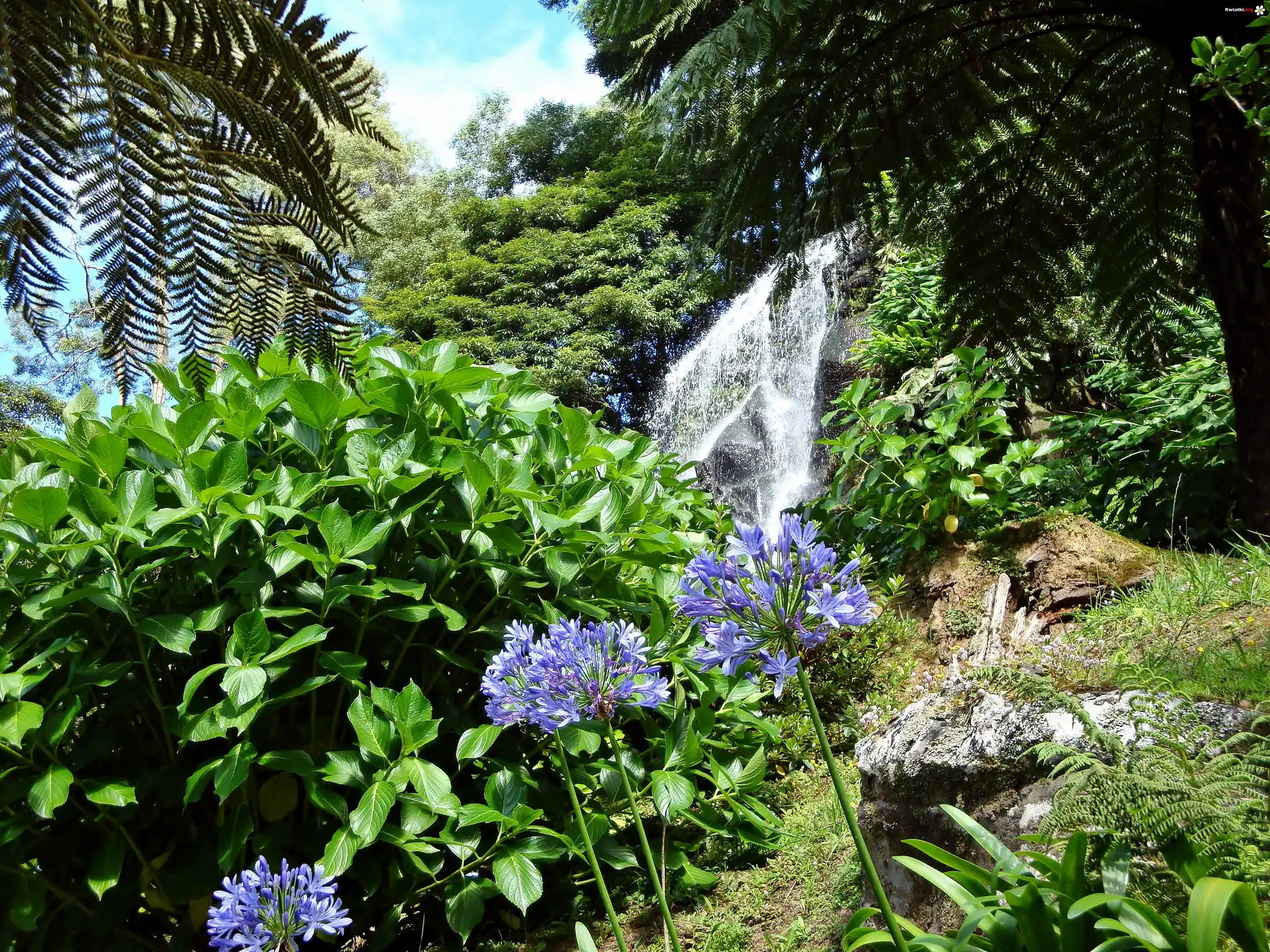 Las, Wodospad, Skały, Kwitnące, Agapanty - Zdjęcia