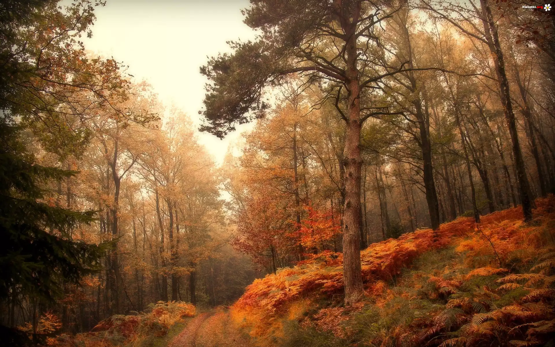 Kwiat Las, Jesień, Dróżka, Paprocie, Drzewa