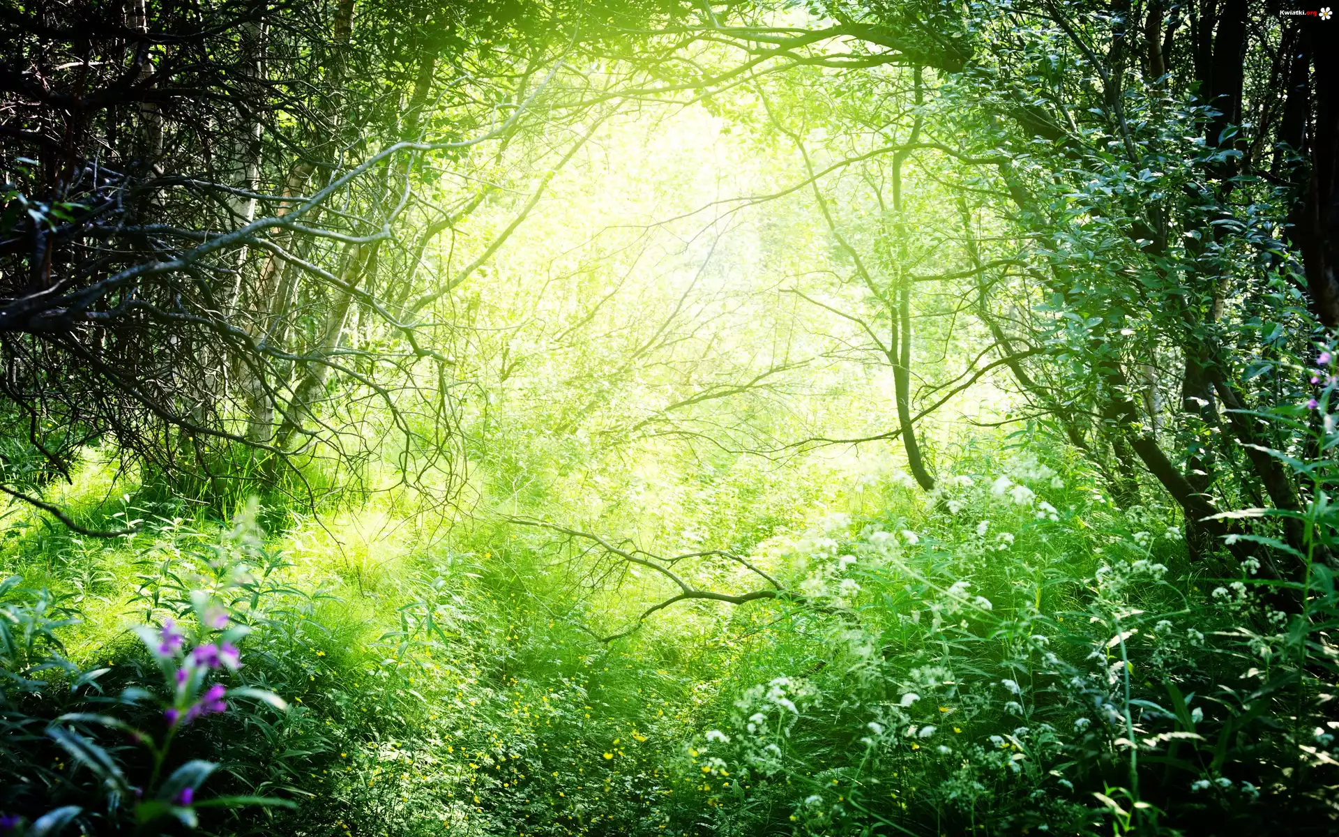 Kwiat Las, Drzewa, Trawy, Kwiaty, Przebijające, Światło