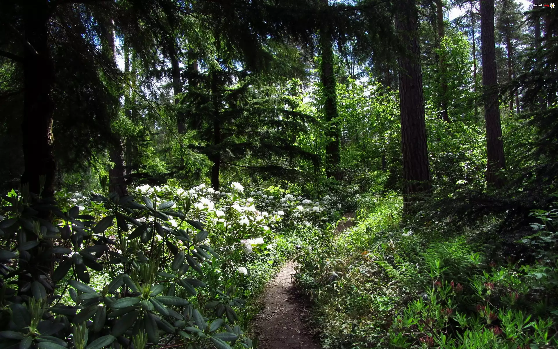 Las, Ścieżka, Kwiaty, Przebijające, Światło, Wiosna - Zdjęcia