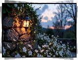Mur, Latarnia, Białe, Kwiaty, Drzewa - Zdjęcia