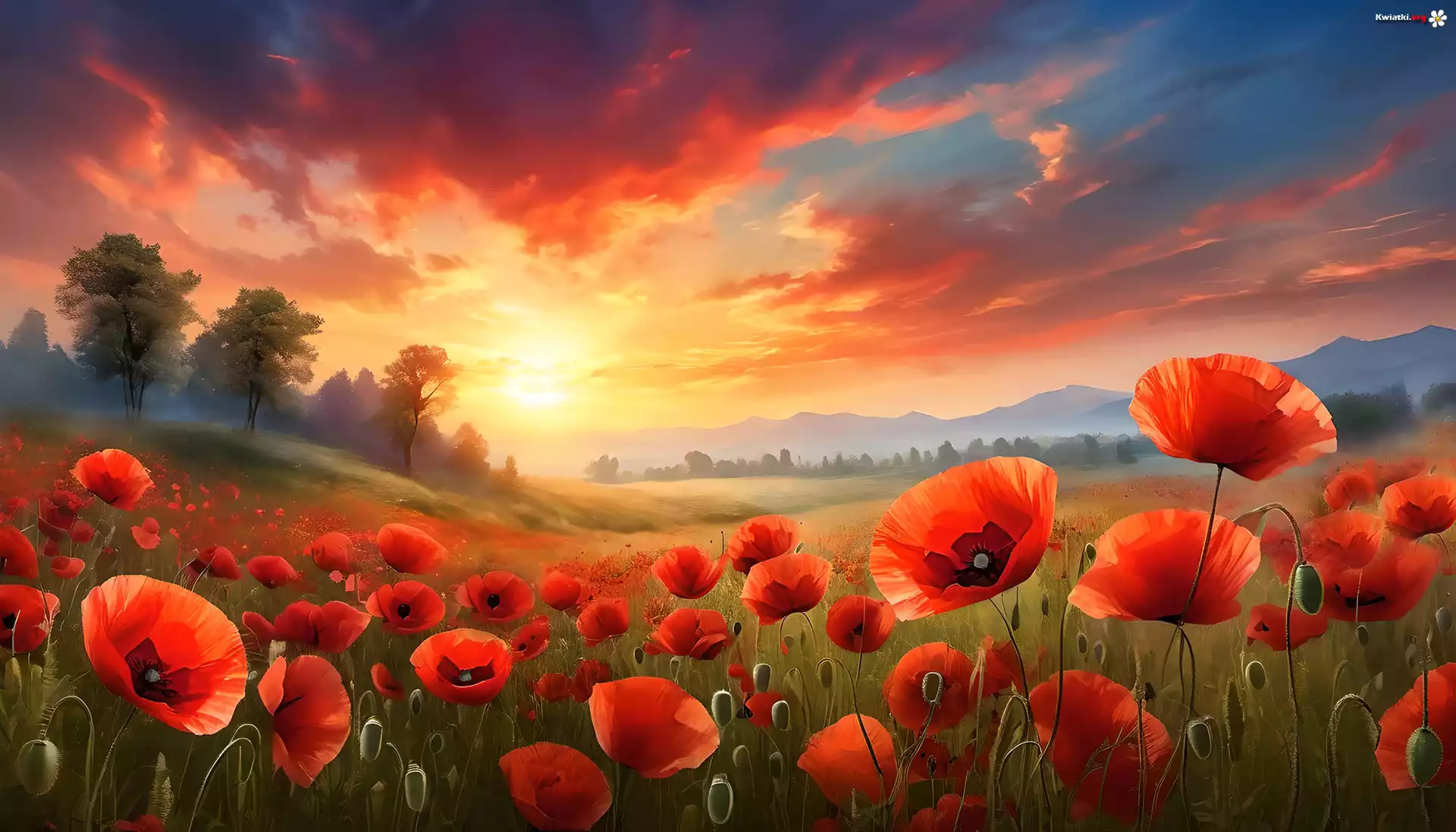 Kwiat Czerwone, Maki, Łąka, Lato, Niebo, Wschód słońca