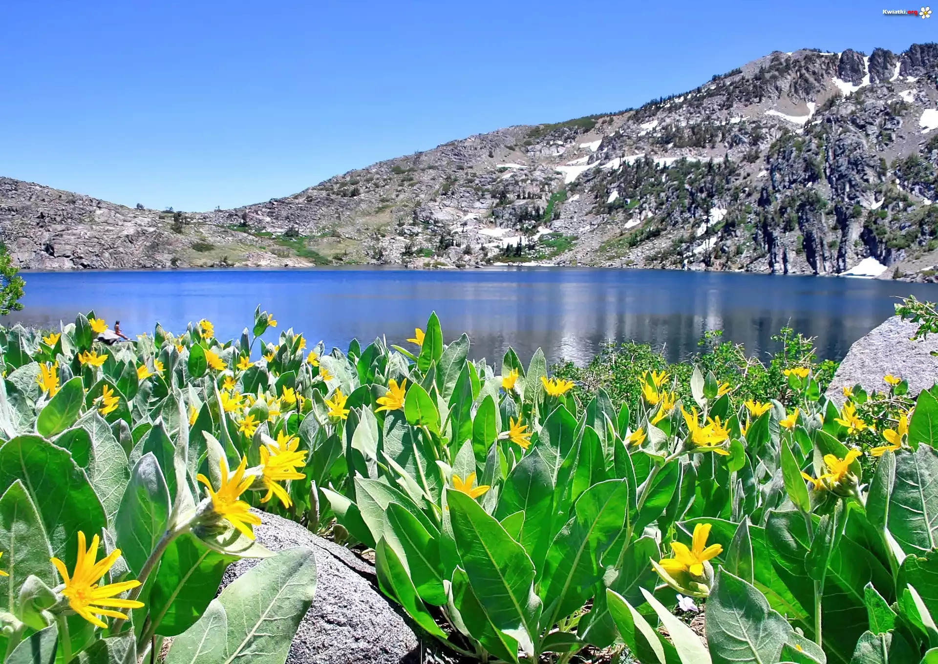 Kwiat Lato, Góry, Jezioro, Głazy, Żółte, Kwiaty