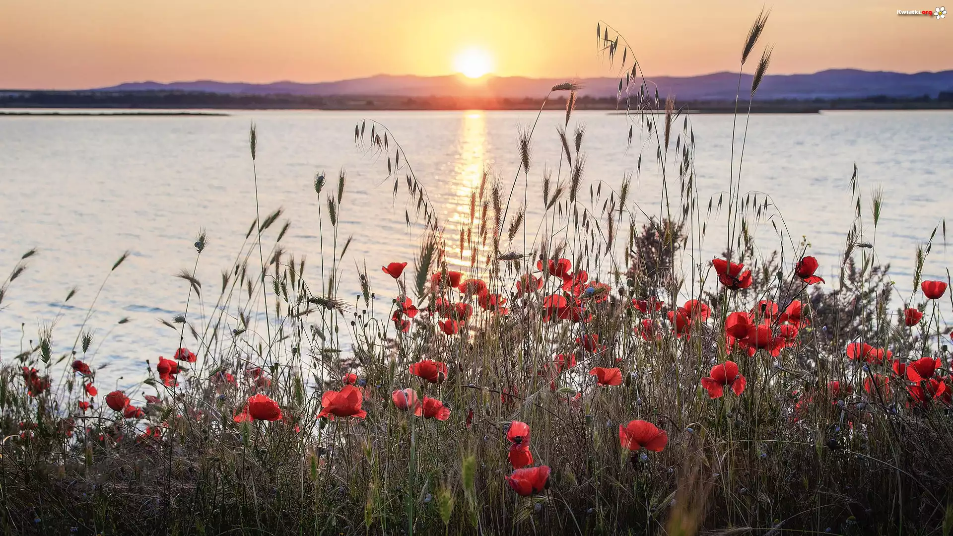 Lato, Góry, Jezioro, Kwiaty, Maki, Świt, Brzeg, Zboże, Wschód słońca - Zdjęcia
