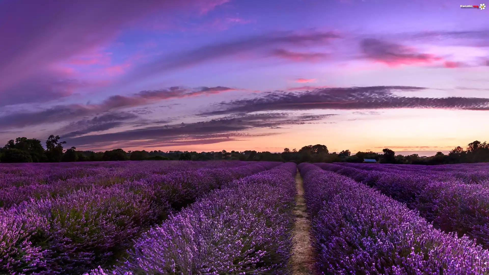 Kwiat Pole, Lawenda, Drzewa, Chmury