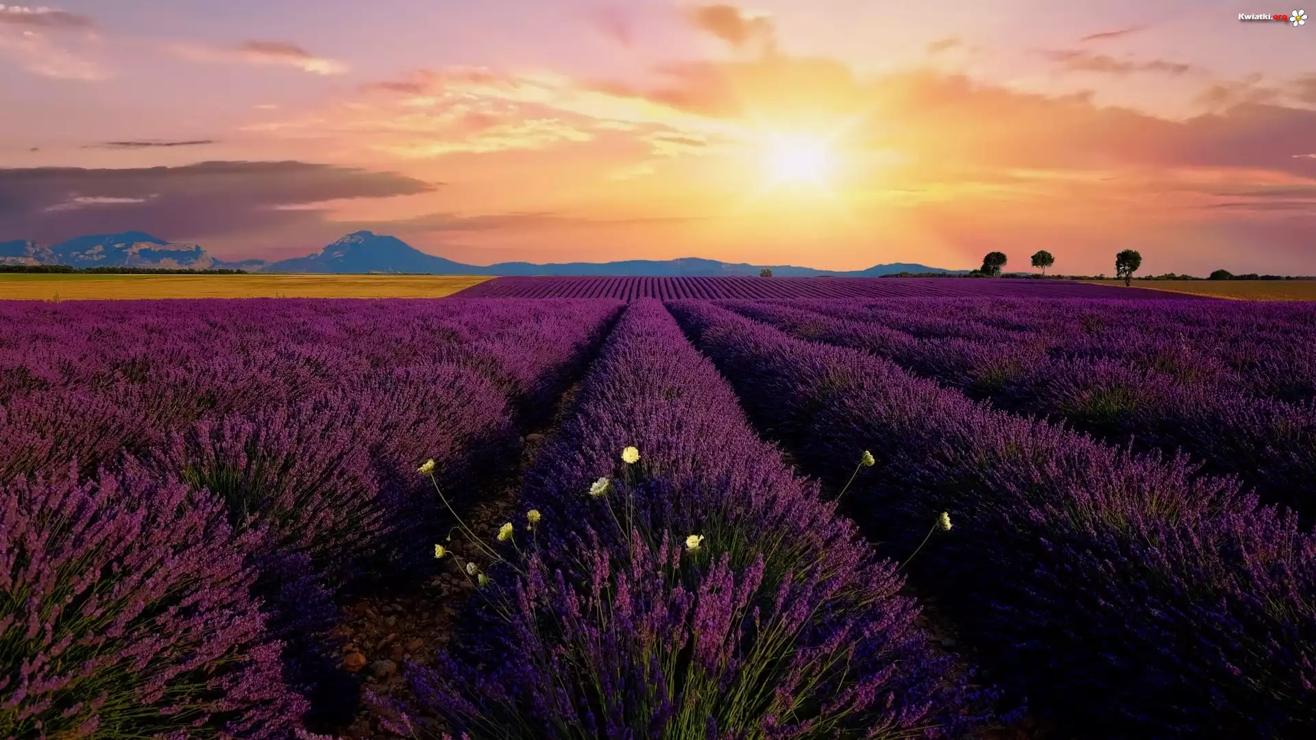 Kwiat Wschód słońca, Pole, Lawenda, Góry, Drzewa