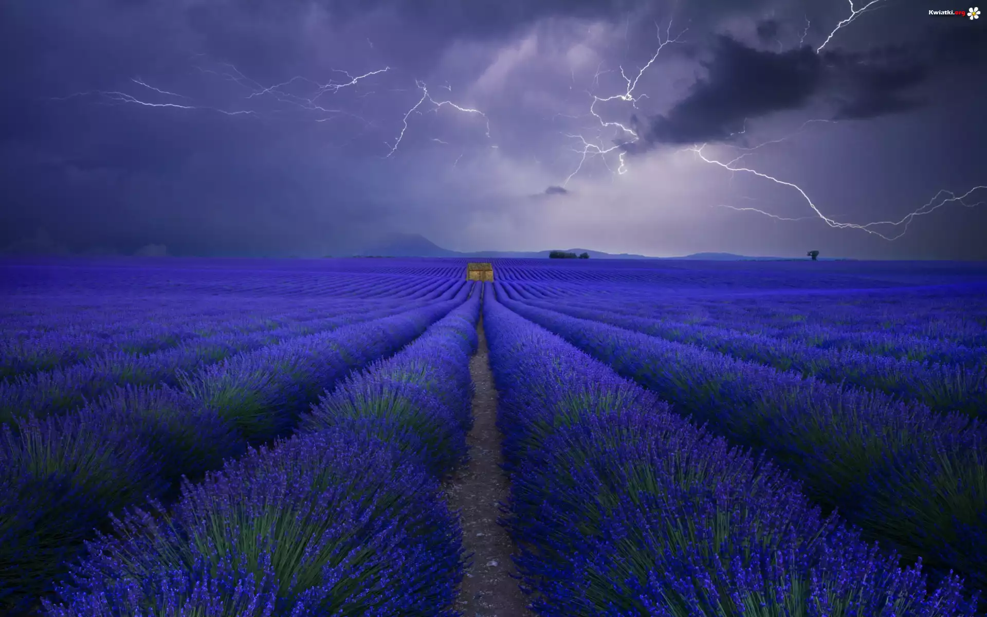 Kwiat Pole, Lawenda, Dom, Wieczór, Niebo, Chmury, Pioruny