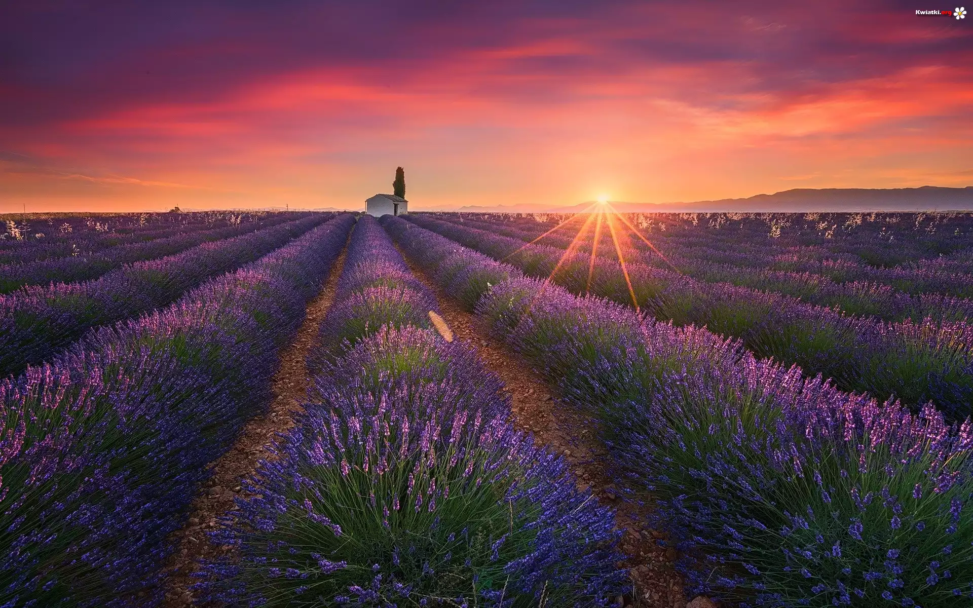Kwiat Lawenda, Pole, Zachód słońca, Dom