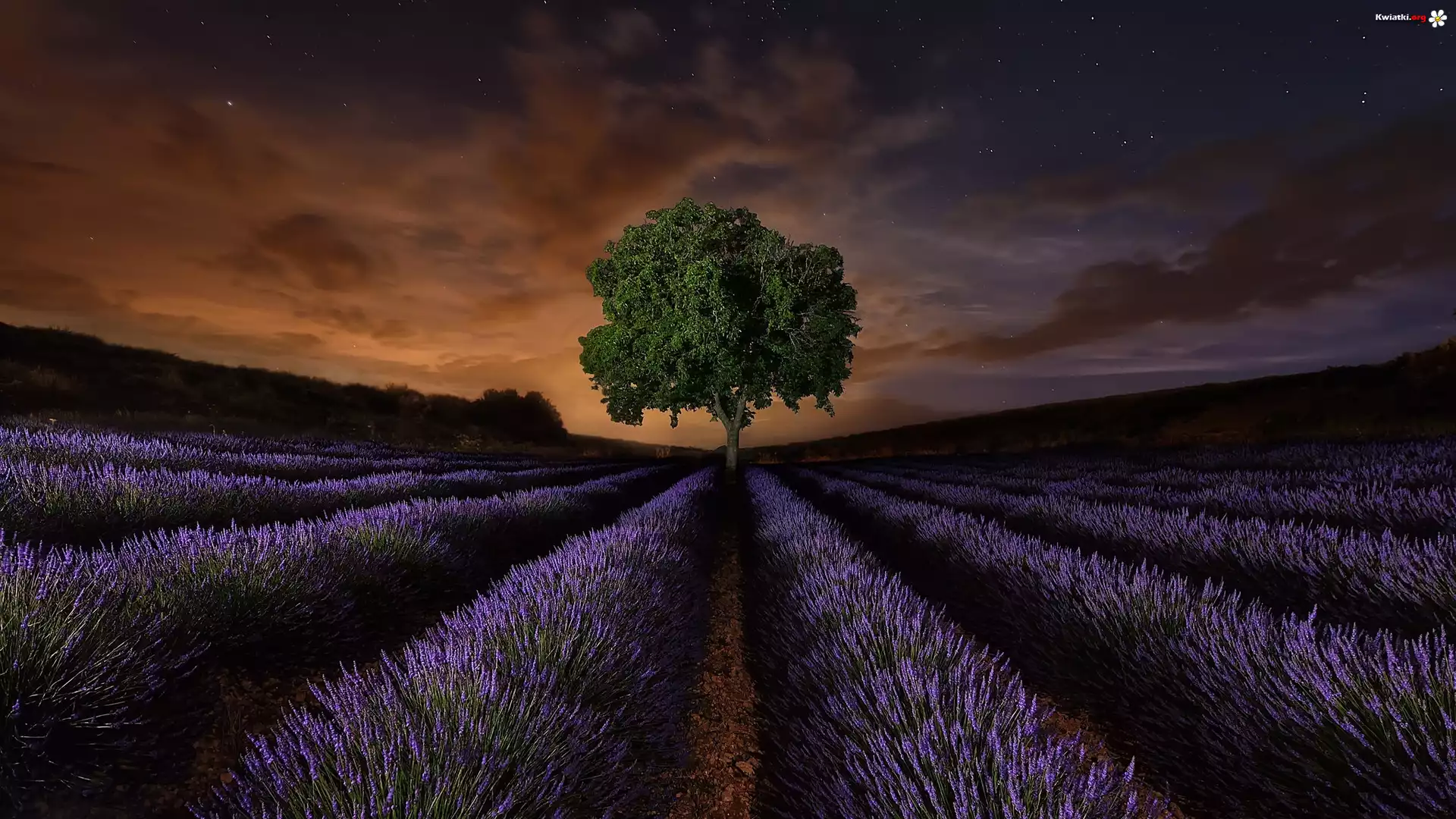 Lawenda, Plantacja, Drzewo, Zachód słońca - Zdjęcia