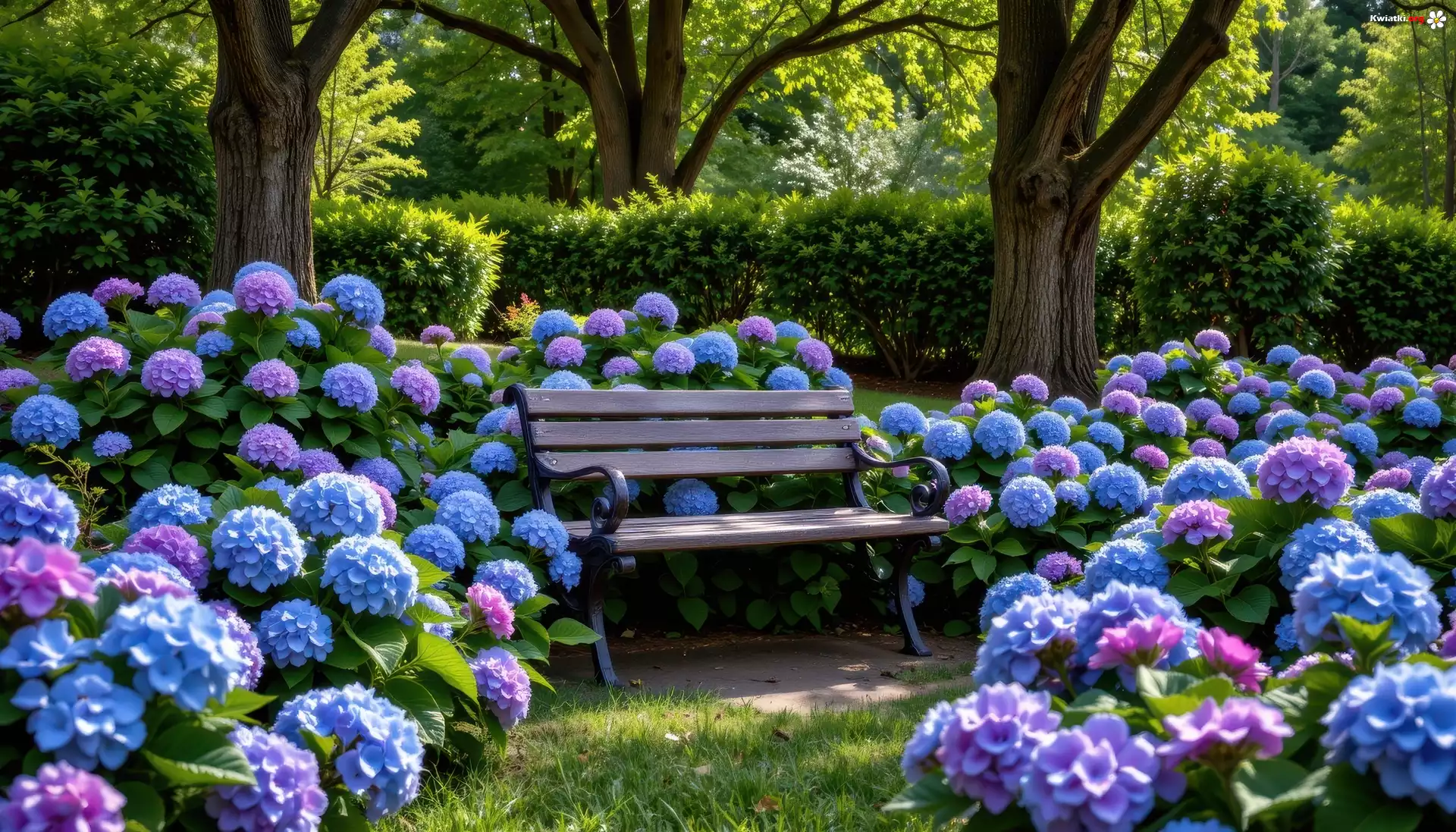 Hortensje, Różowe, Niebieskie, Ławka, Park, Drzewa - Zdjęcia