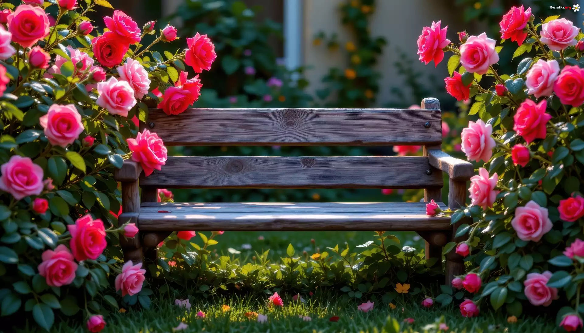 Kwiat Drewniana, Ławka, Różowe, Czerwone, Róże