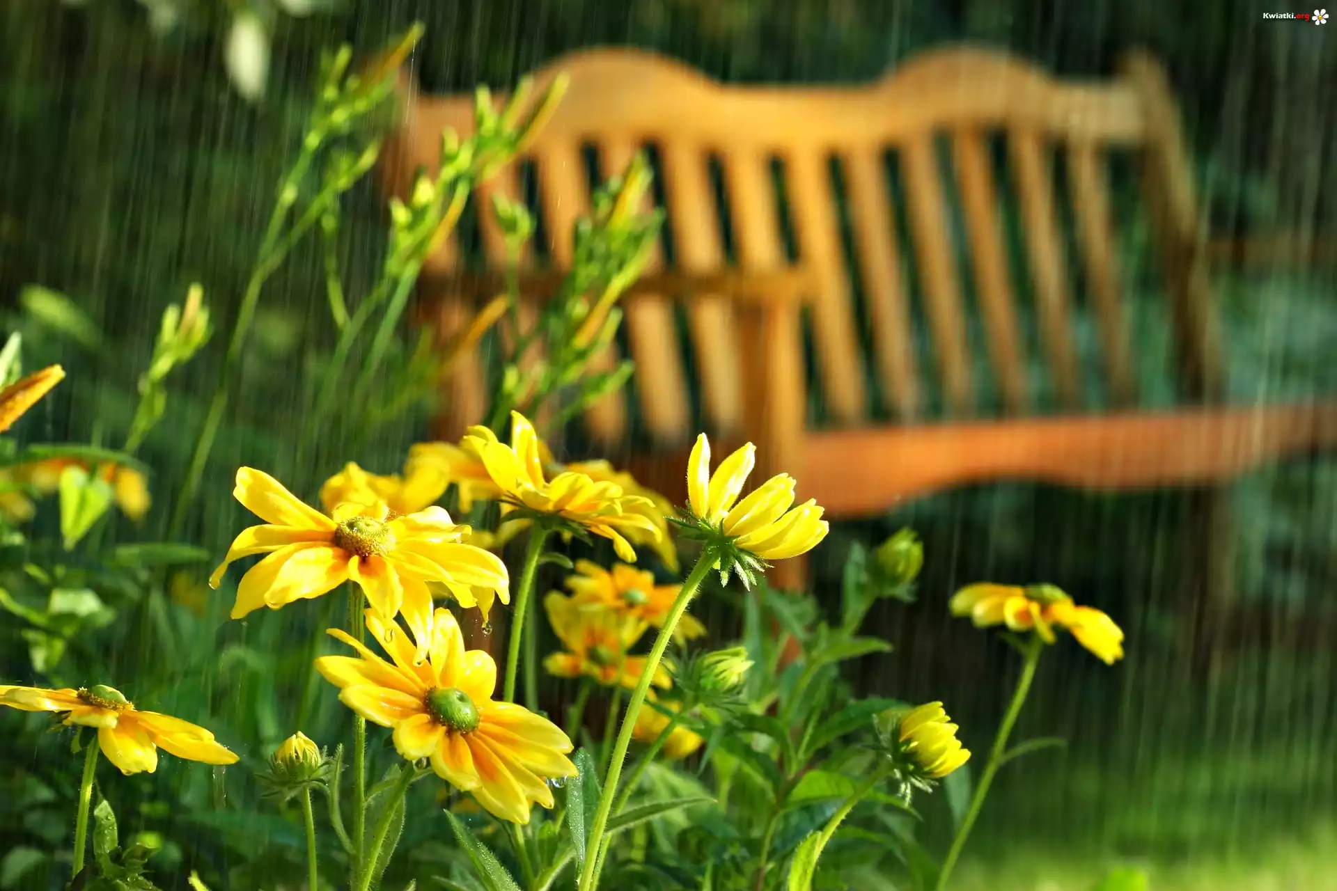 Żółte, Kwiaty, Ławka, Letni Deszcz - Zdjęcia