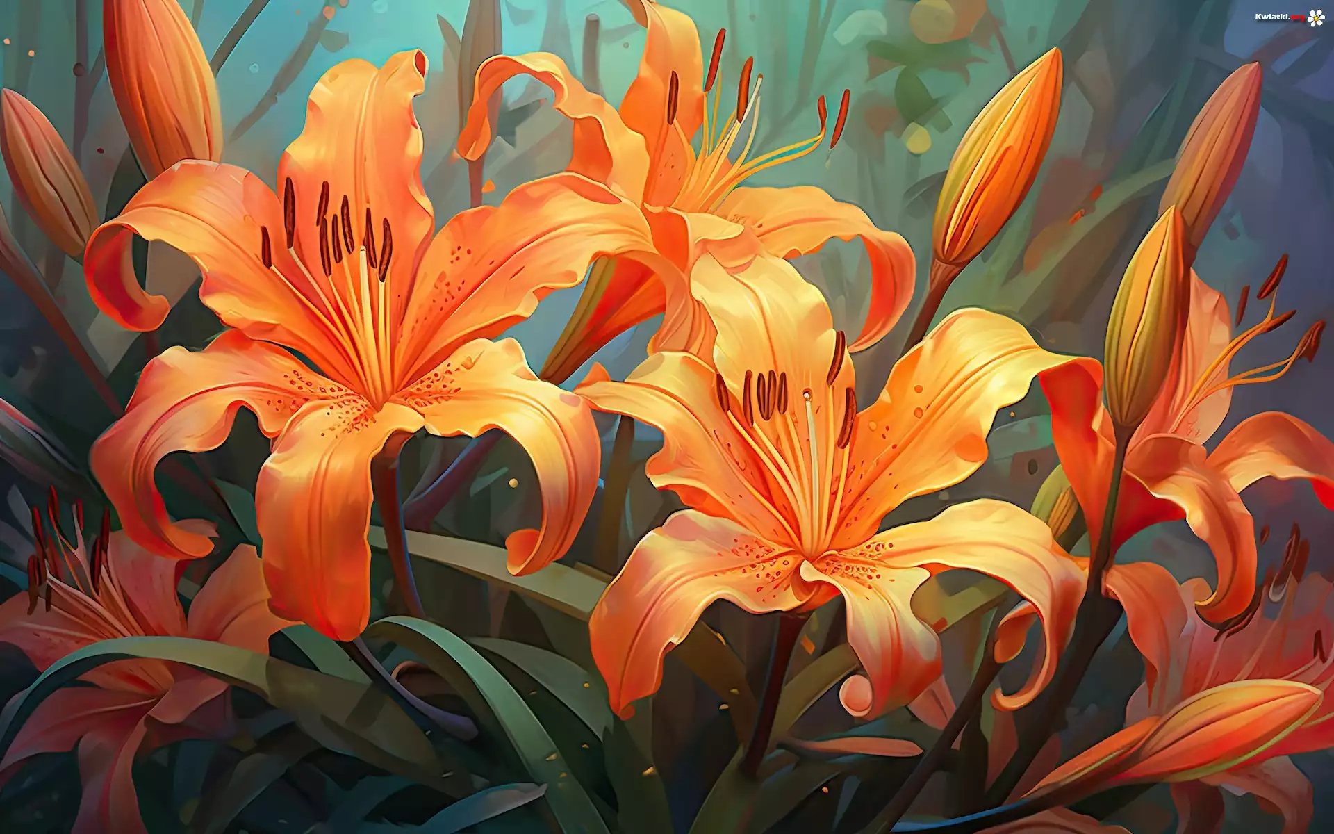 Kwiaty, Lilie, Pąki, Pomarańczowe, Grafika - Zdjęcia