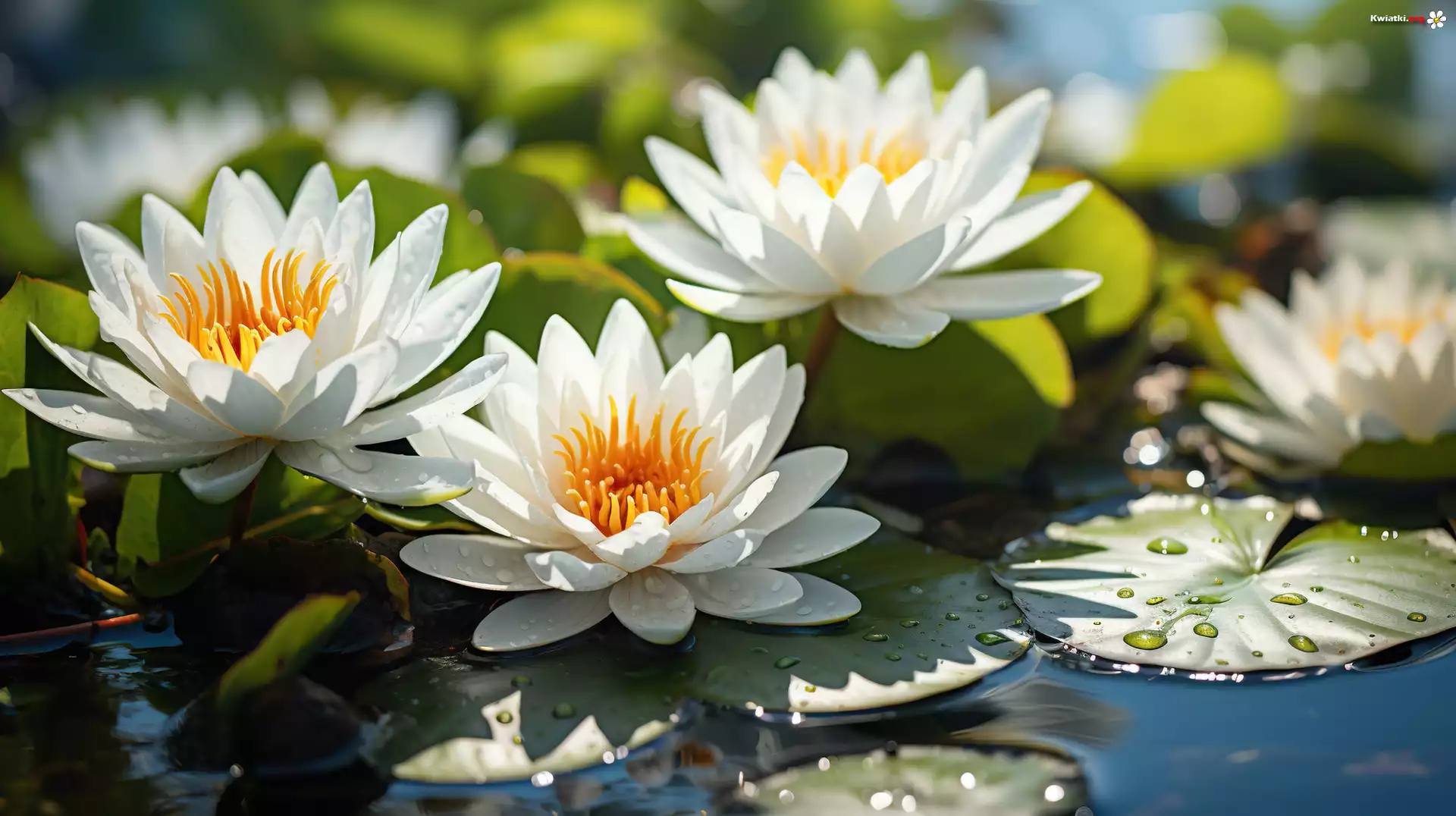 Kwiat Białe, Lilie wodne, Liście, Woda