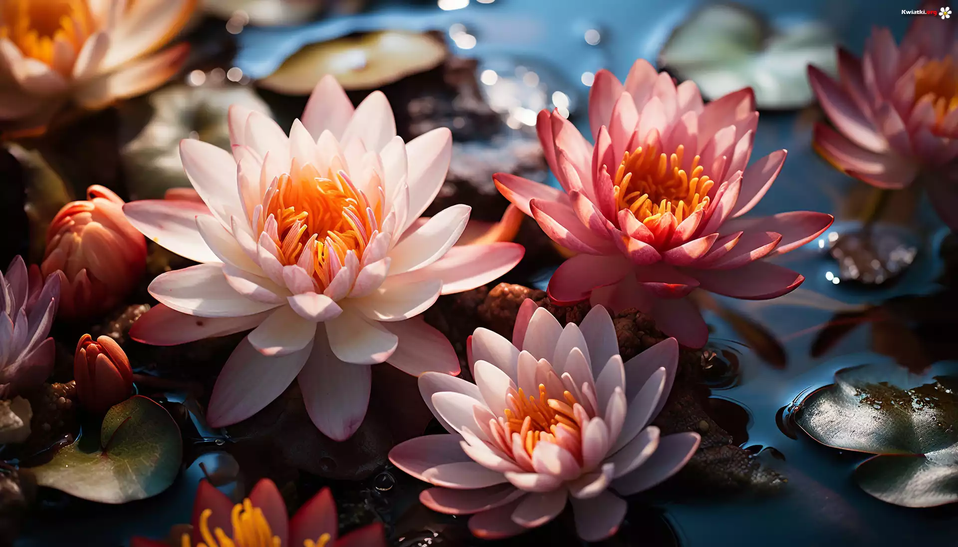 Różowe, Lilie wodne, Liście, Woda - Zdjęcia
