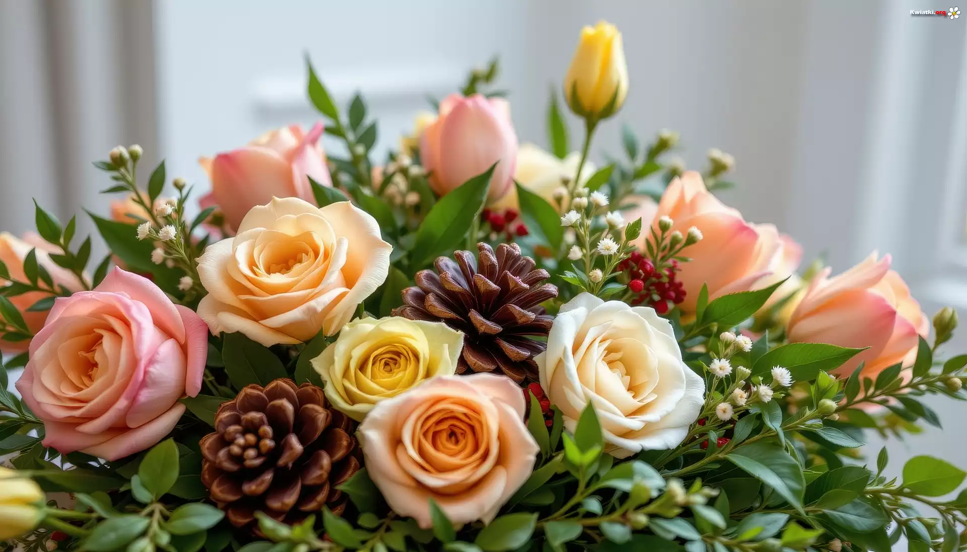 Kwiaty, Róże, Szyszki, Liście, Grafika AI - Zdjęcia