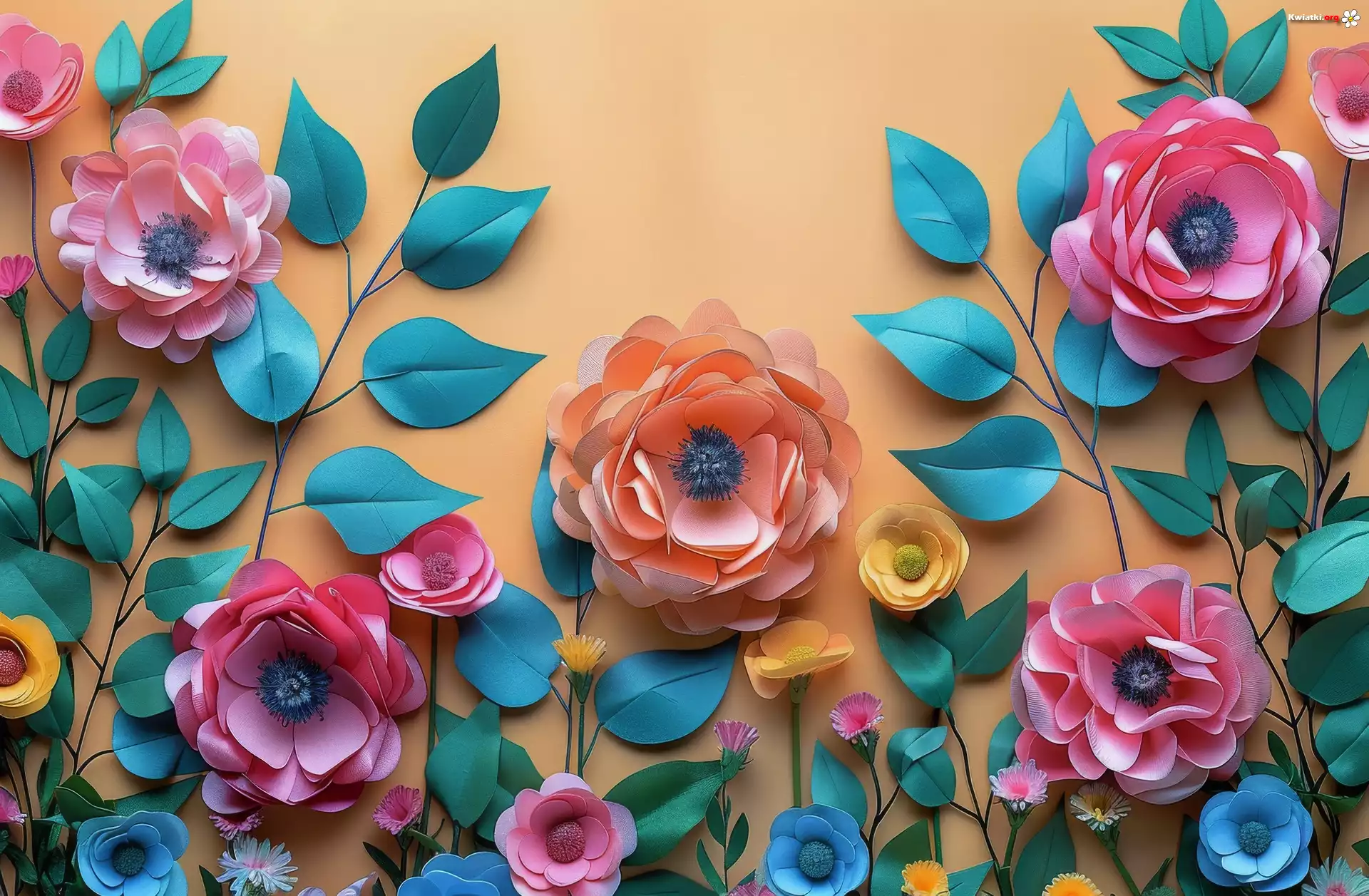 Kolorowe, Kwiaty, Gałęzie, Liście, Pomarańczowe, Tło, Grafika - Zdjęcia