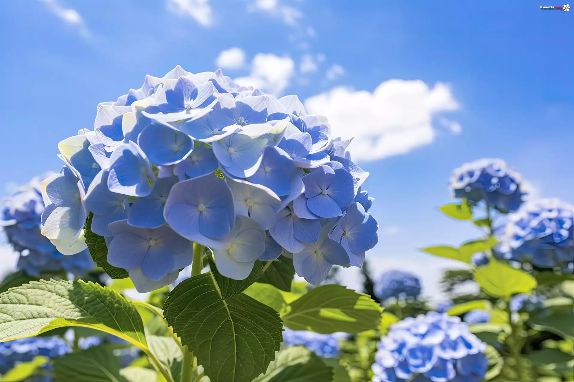 Niebieskie, Kwiaty, Hortensje, Liście, Niebo, Grafika - Zdjęcia
