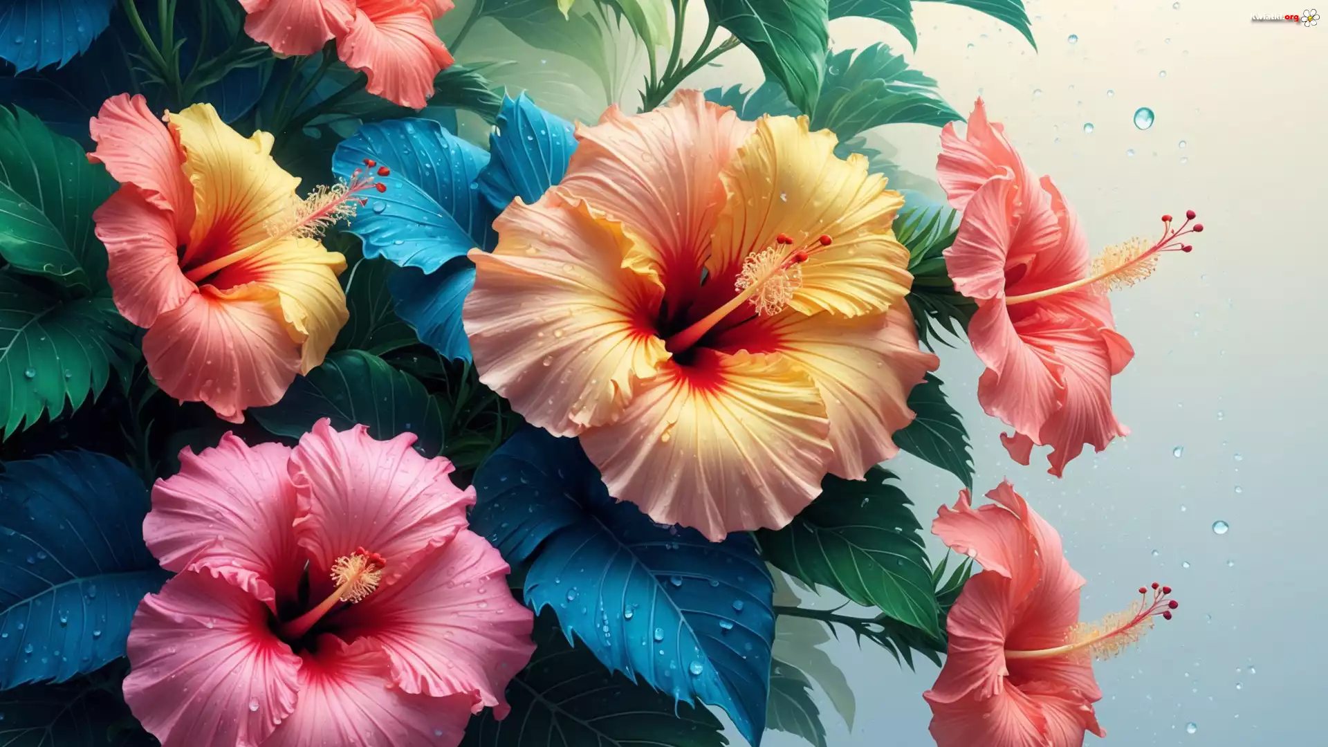 Hibiskusy, Kolorowe, Kwiaty, Liście, Krople, Grafika - Zdjęcia