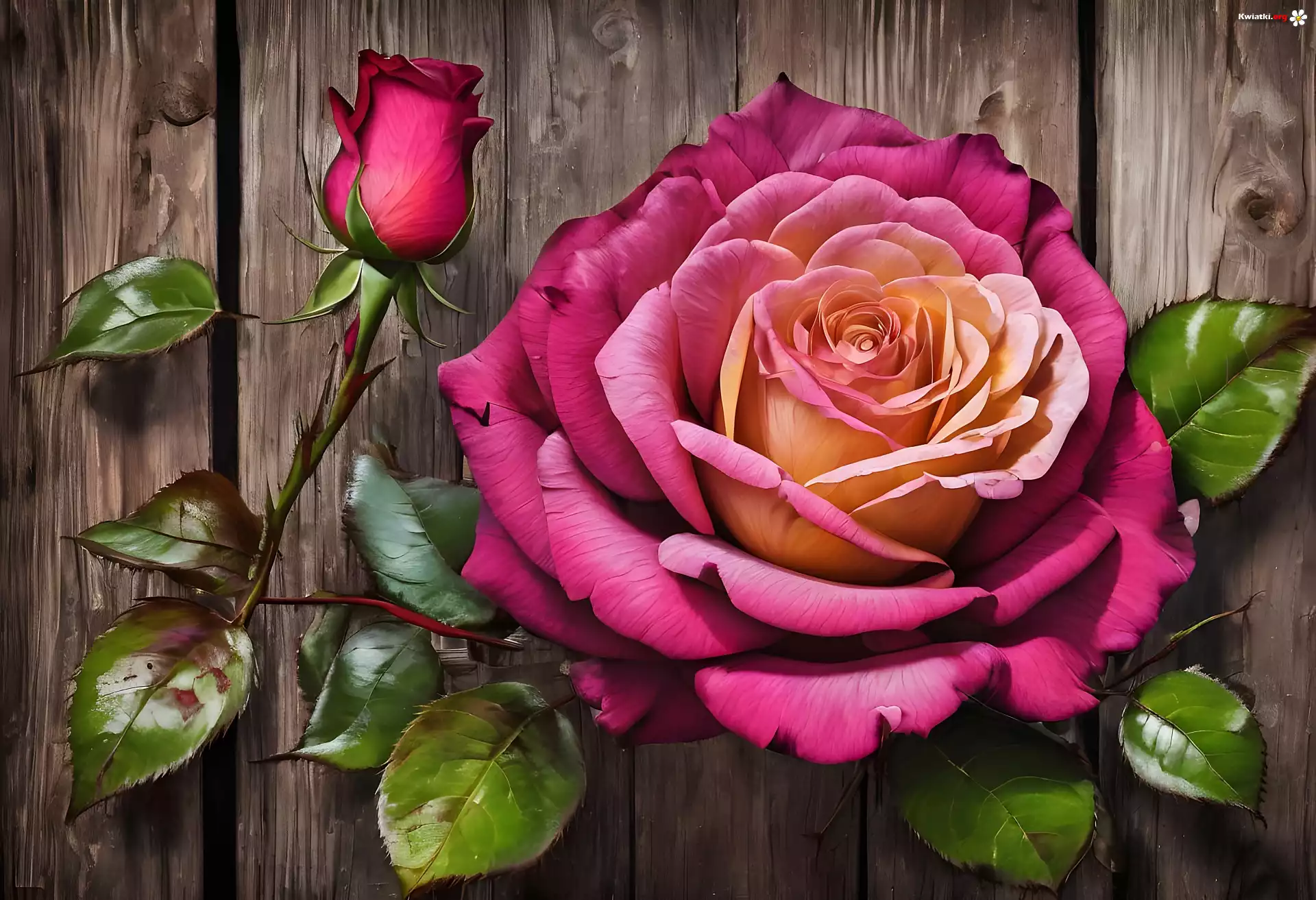 Róża, Kwiat, Pąk, Liście, Deski, Grafika - Zdjęcia