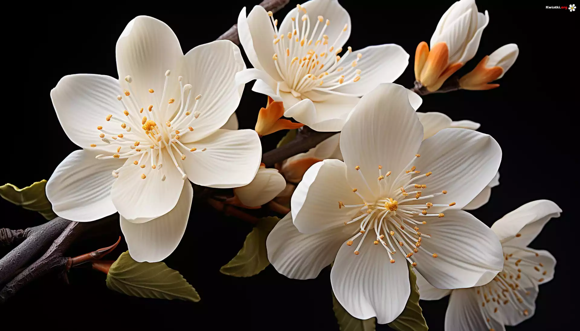 Kwiaty, Białe, Pąki, Liście, Gałązka, Grafika - Zdjęcia