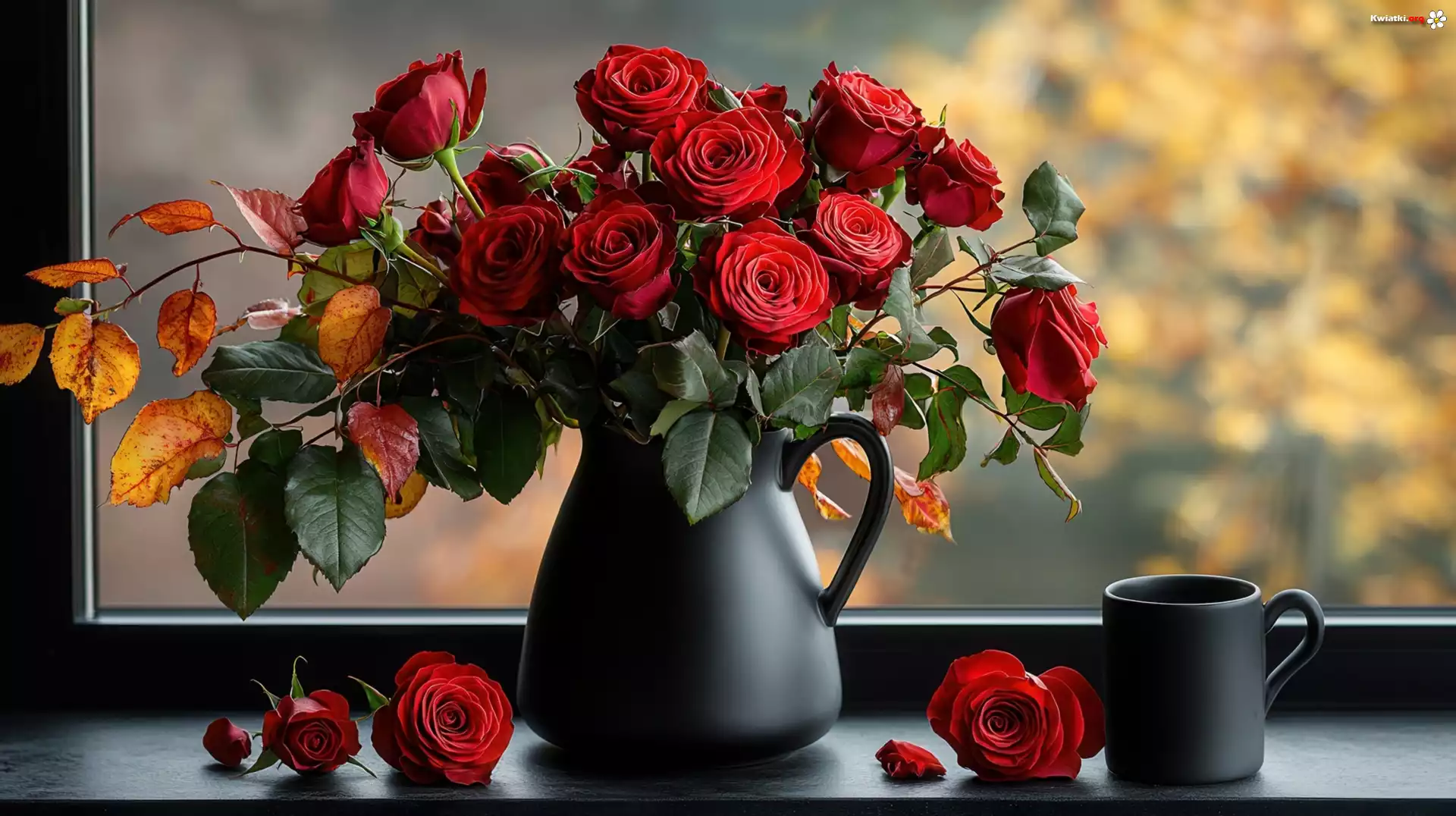 Kwiat Czerwone, Róże, Jesienne, Liście, Dzbanek, Okno, Kubek
