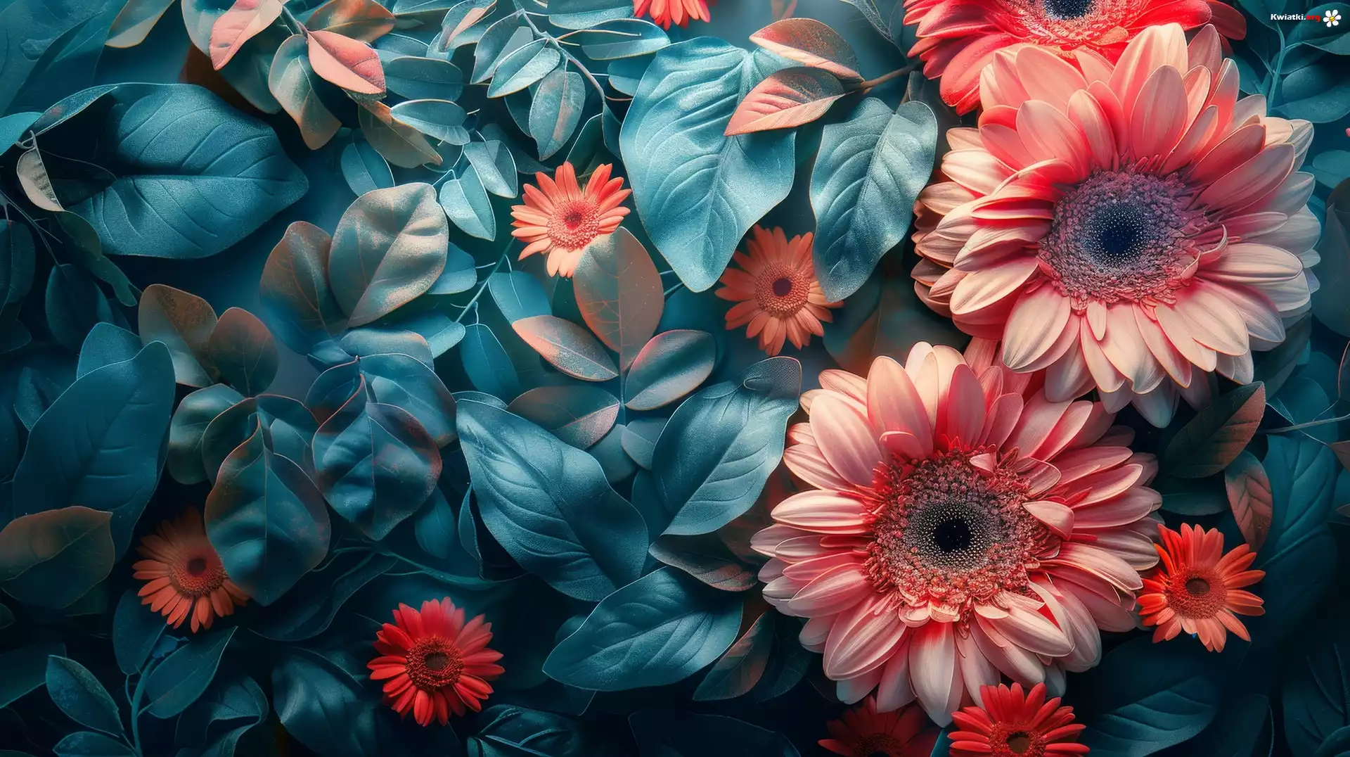 Kwiaty, Gerbery, Niebieskie, Liście - Zdjęcia