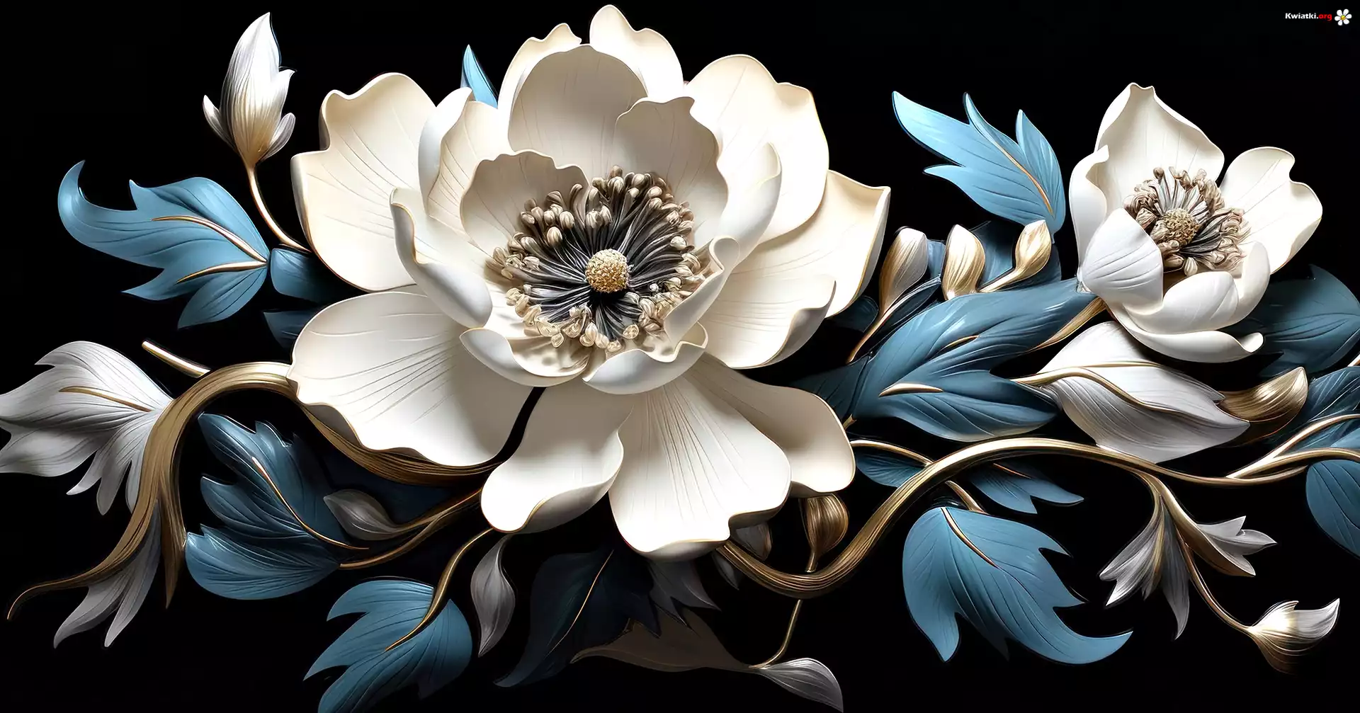 Białe, Kwiaty, Niebieskie, Liście, Czarne, Tło, Grafika - Zdjęcia