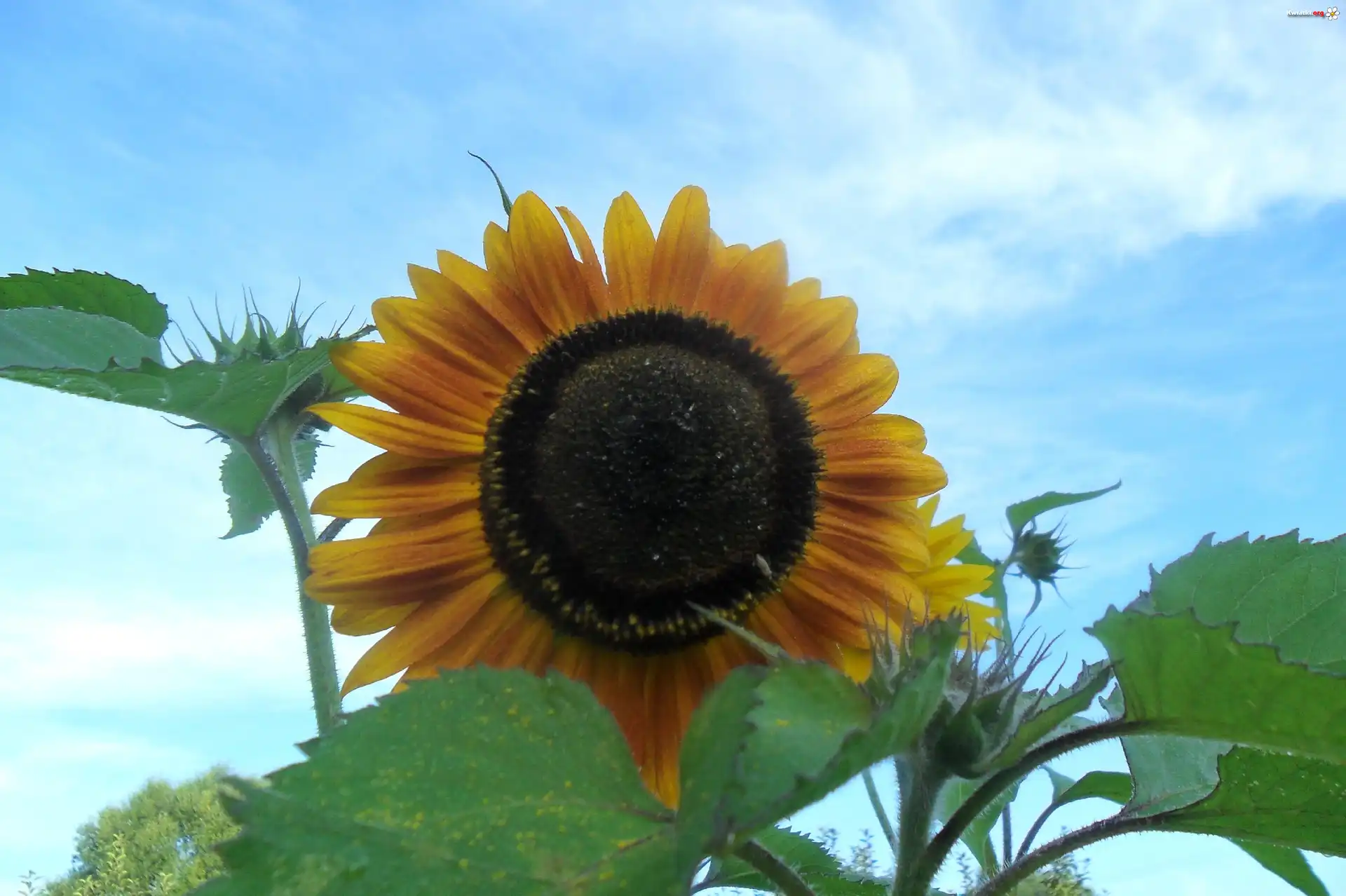 Kwiat Słonecznik, Liście, Niebo