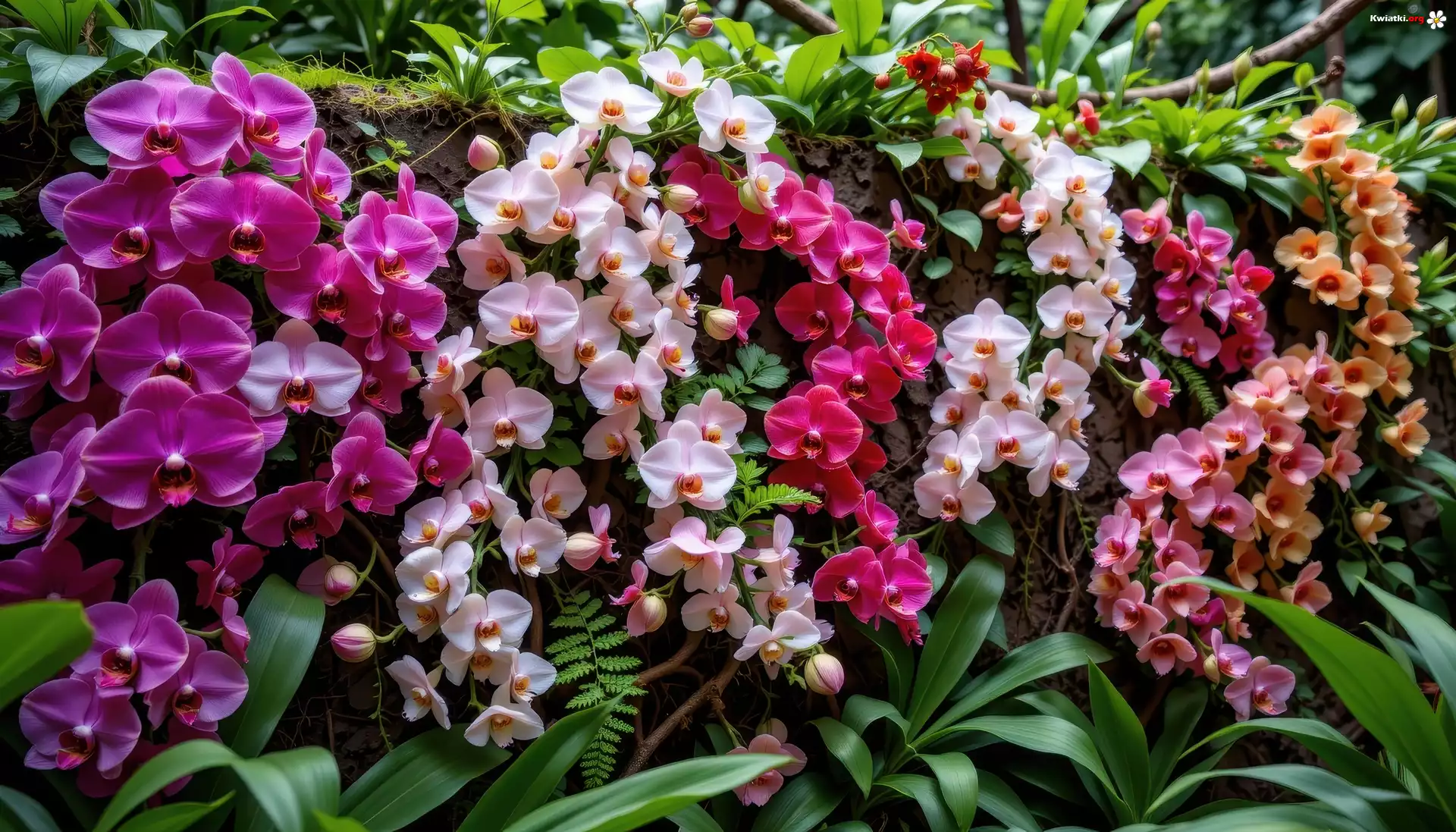Kwiaty, Kolorowe, Storczyki, Liście, Mur, Grafika AI - Zdjęcia