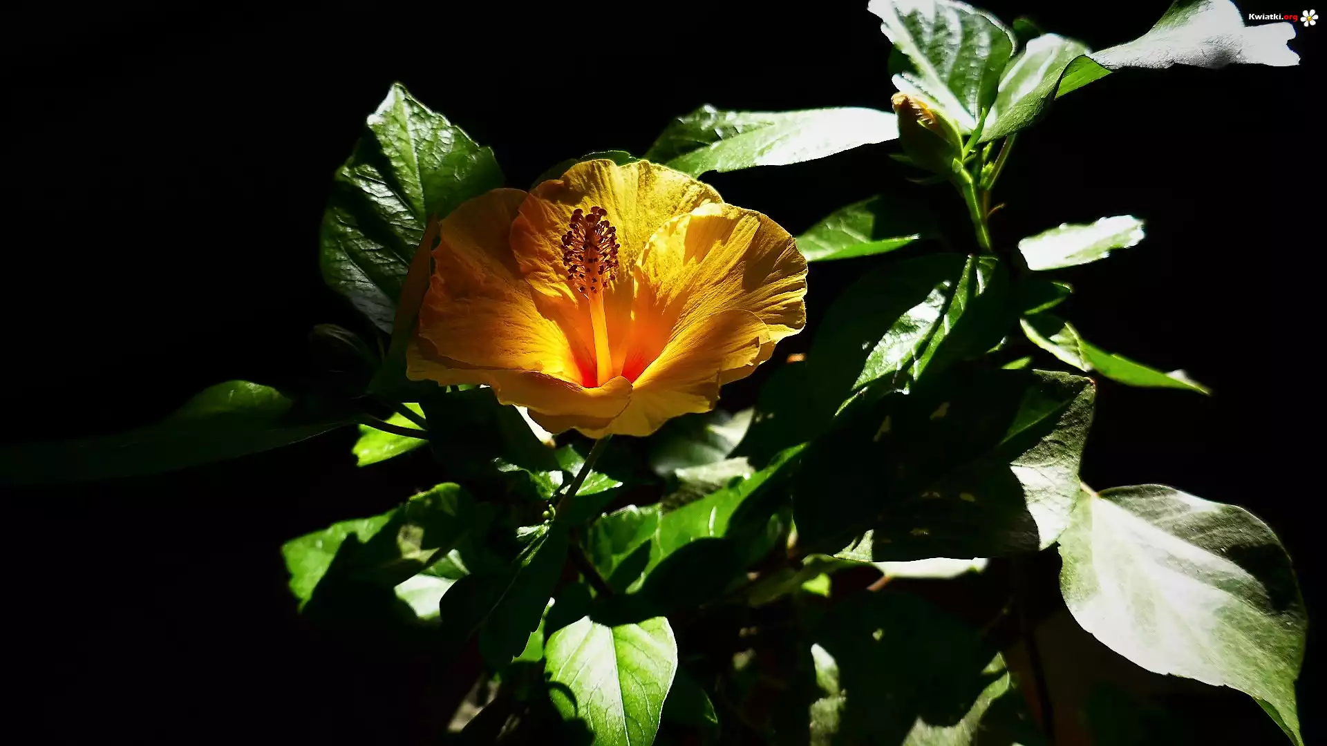 Kwiat, Żółty, Hibiskus, Liście, Czarne tło - Zdjęcia