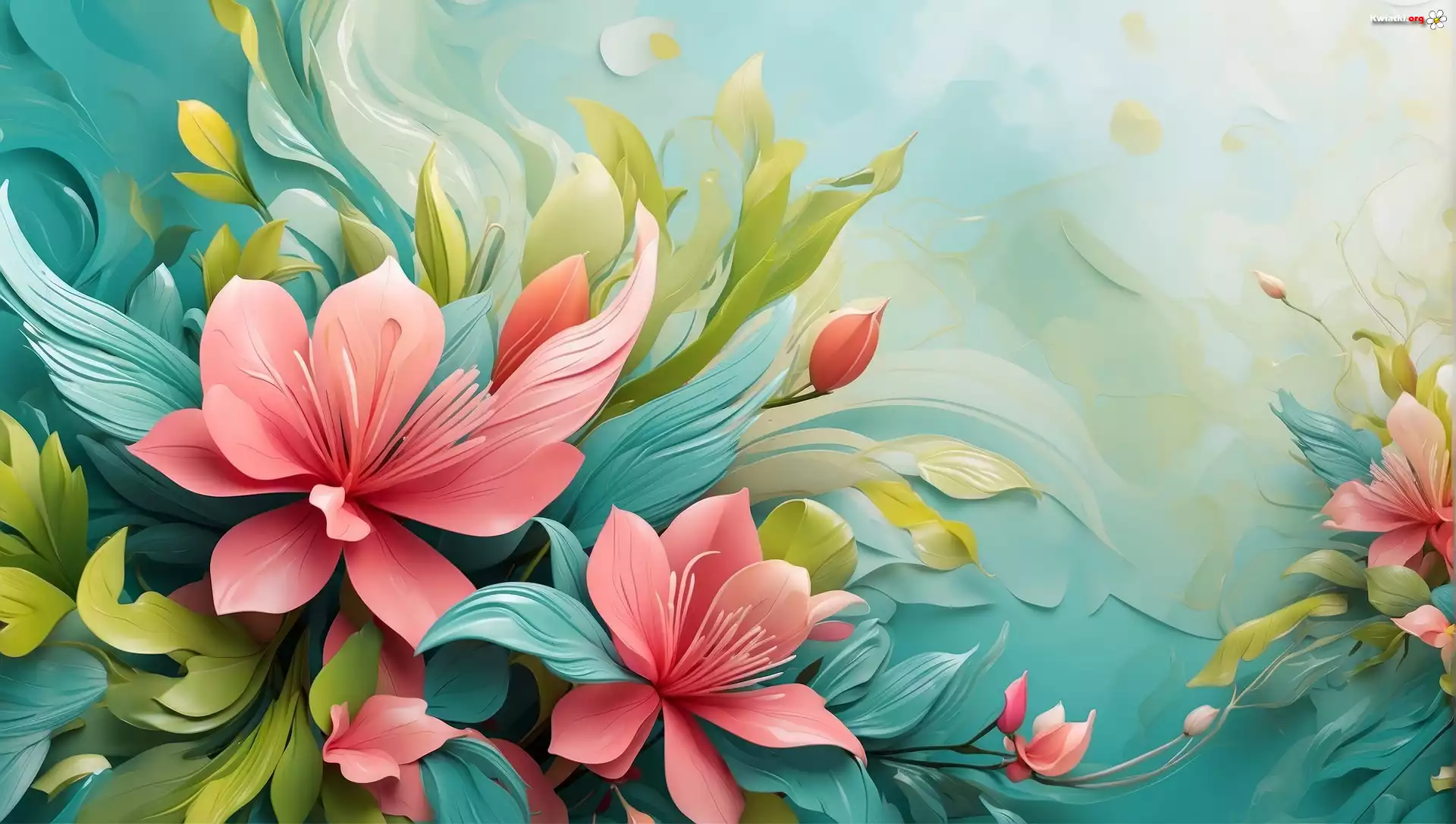 Kwiat Grafika, 2D, Kwiaty, Liście, Wzory, Tło