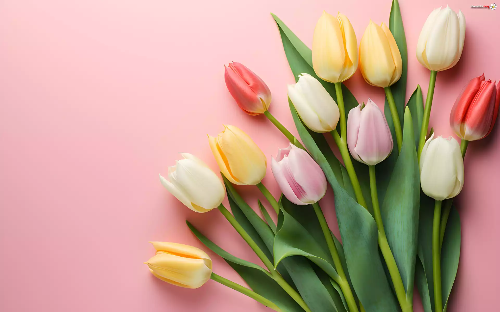 Kwiaty, Kolorowe, Tulipany, Liście, Różowe tło - Zdjęcia