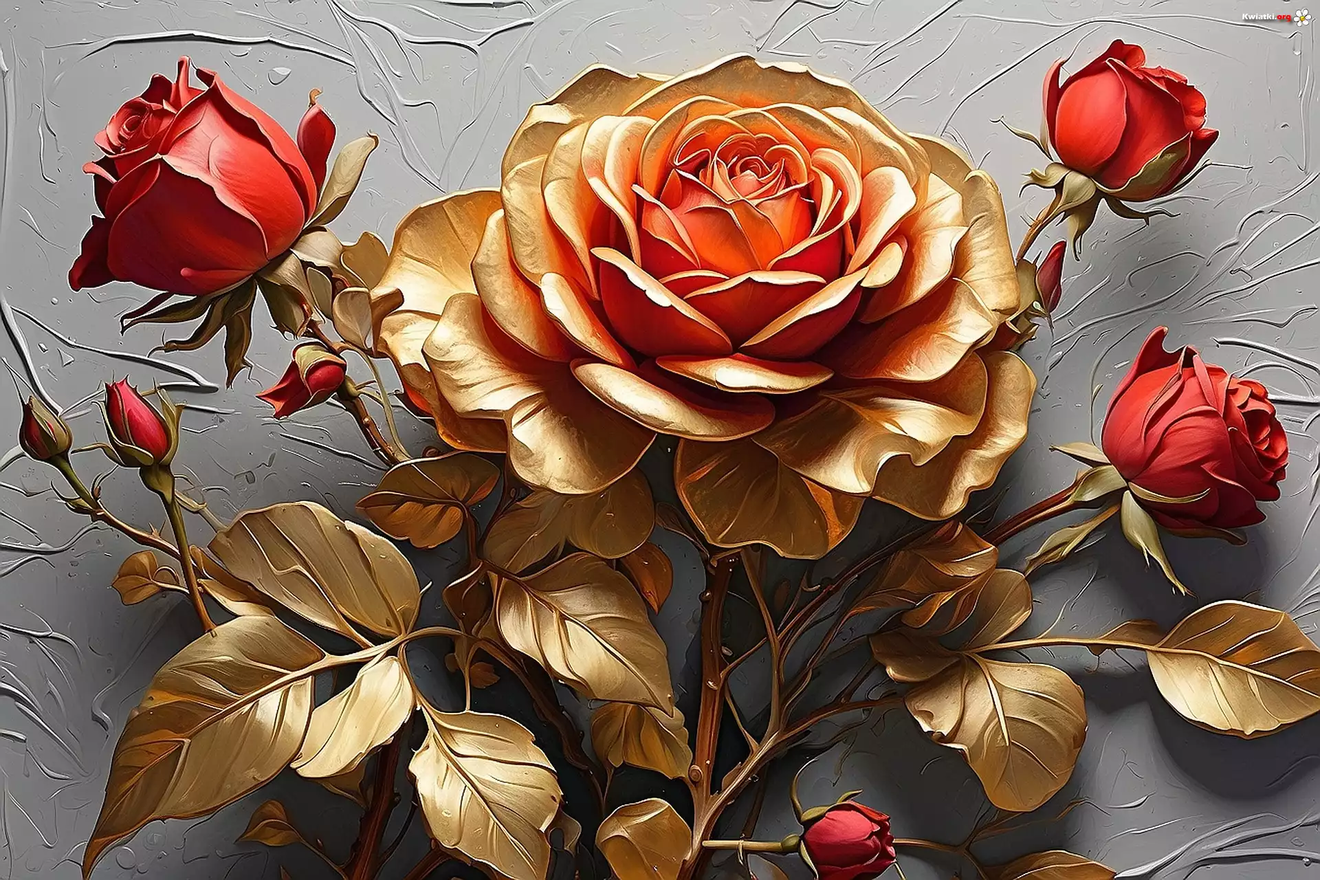 Róże, Czerwone, Złota, Liście, Szare tło, Grafika - Zdjęcia