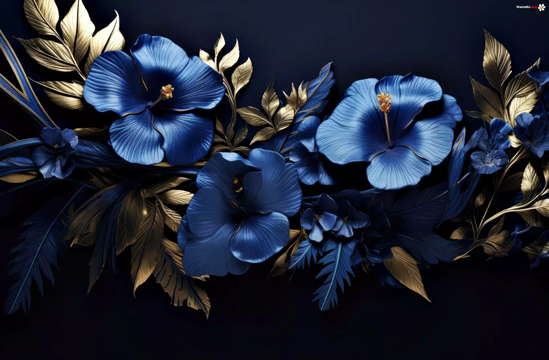 Kwiaty, Granatowe, Złote, Liście, Ciemne, Tło, Grafika - Zdjęcia