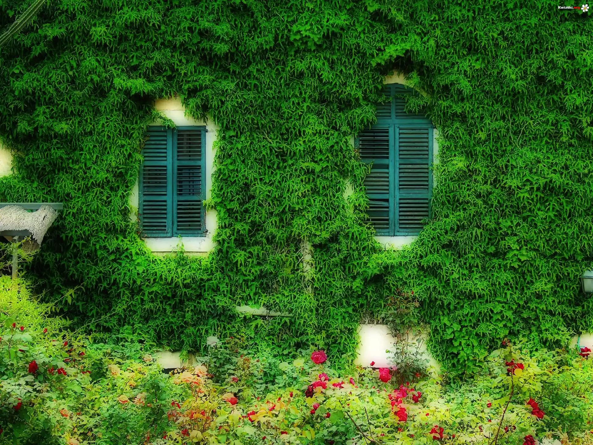 Kwiat Ściana, Domu, Pokryta, Liśćmi, Kwiaty