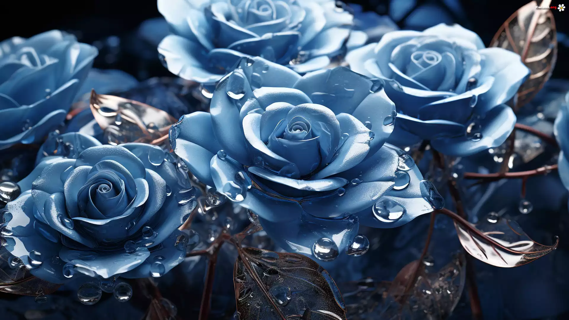 Kwiat Niebieskie, Kwiaty, Róże, Listki, Krople, 2D