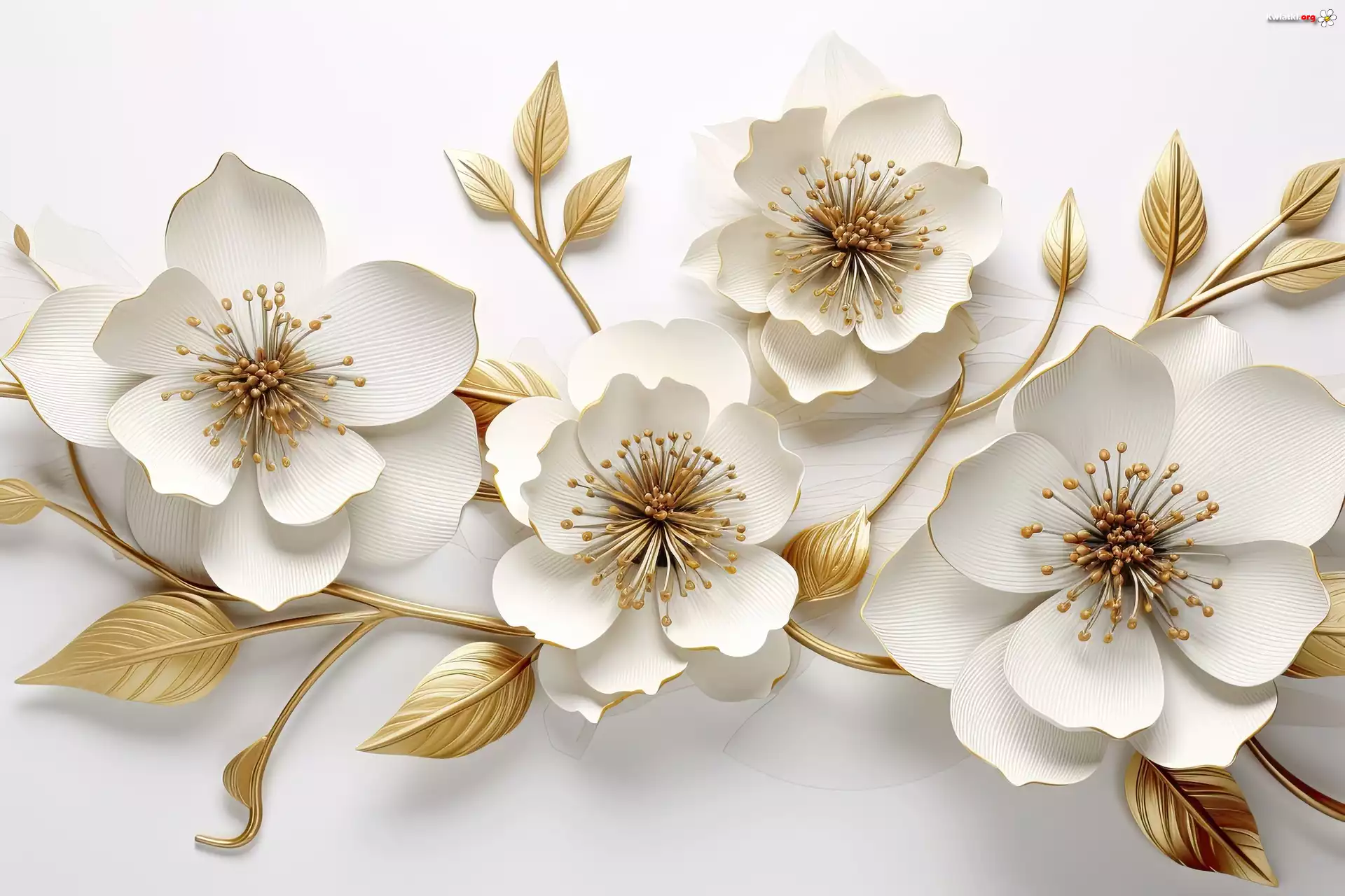 Biało-złote, Kwiaty, Listki, Gałązki, Grafika - Zdjęcia
