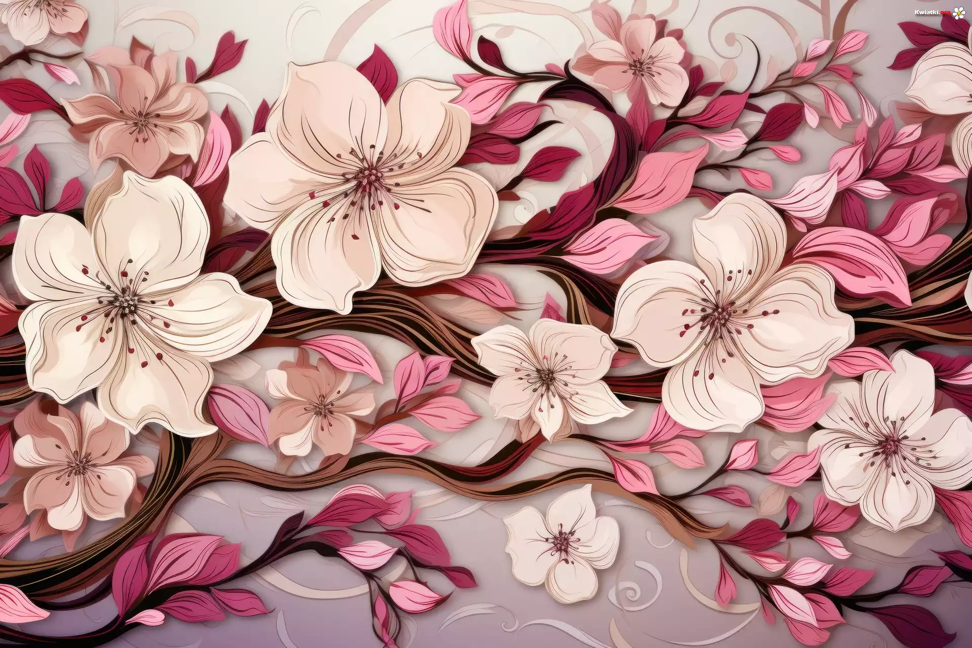 Białe, Kwiaty, Różowe, Listki, Gałęzie, Grafika - Zdjęcia