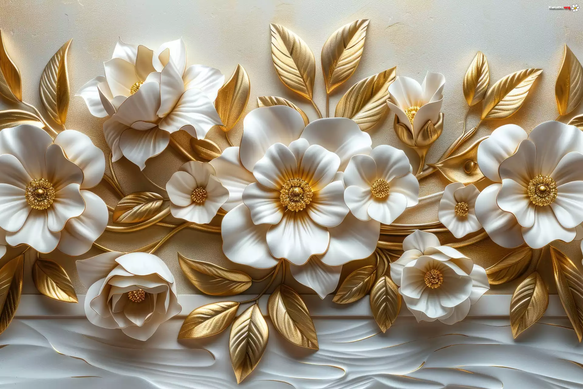 Białe, Kwiaty, Złote, Listki, Gałązki, Grafika - Zdjęcia