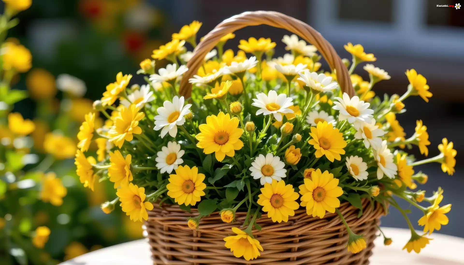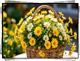 Żółte, Białe, Kwiaty, Listki, Wiklinowy, Koszyk - Zdjęcia